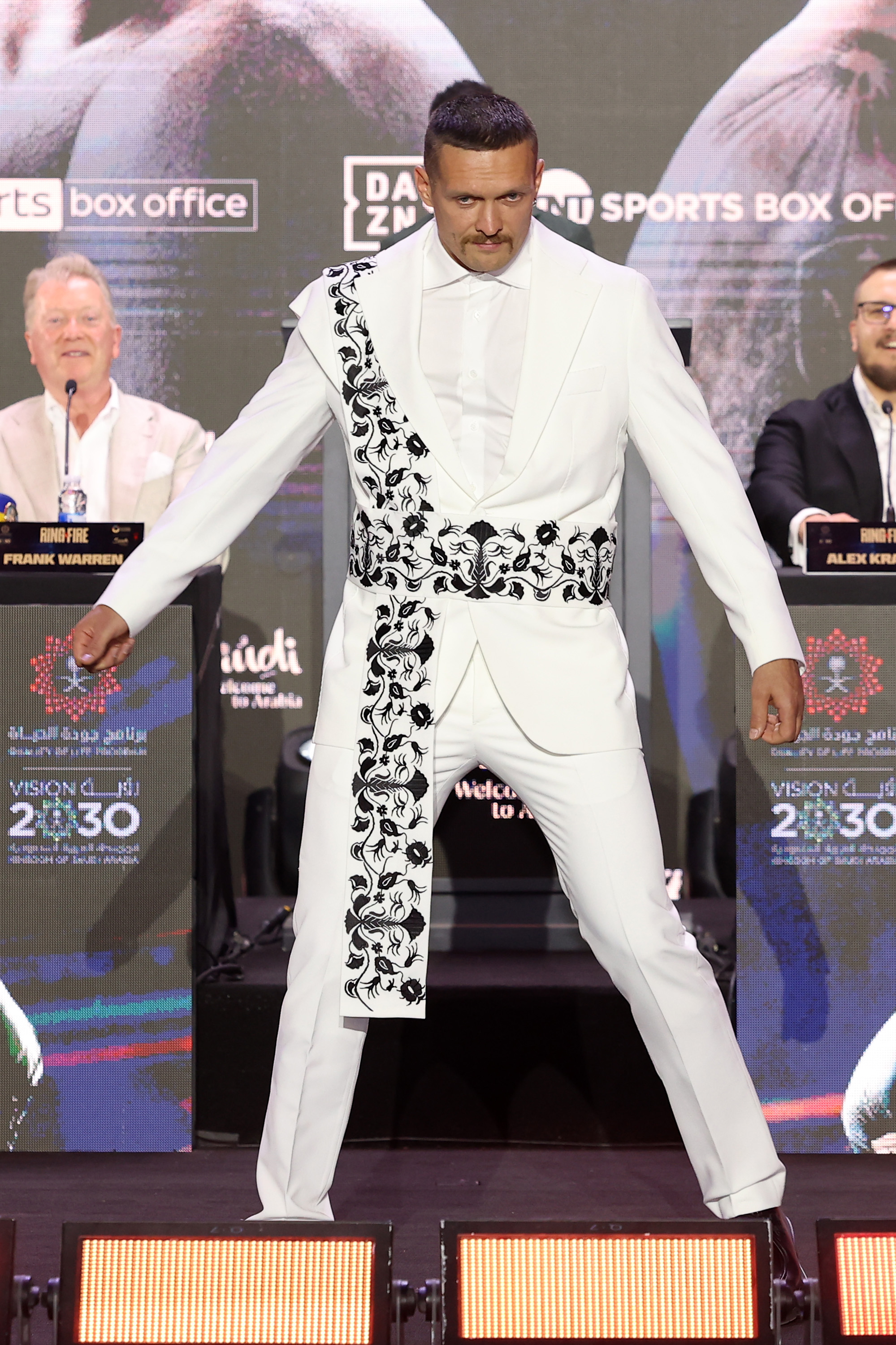 Костюм з кримськотатарським орнаментом костюм для пресконференції перед боєм із Тайсоном Ф’юрі в Ер-Ріяді. Фото: Getty Images