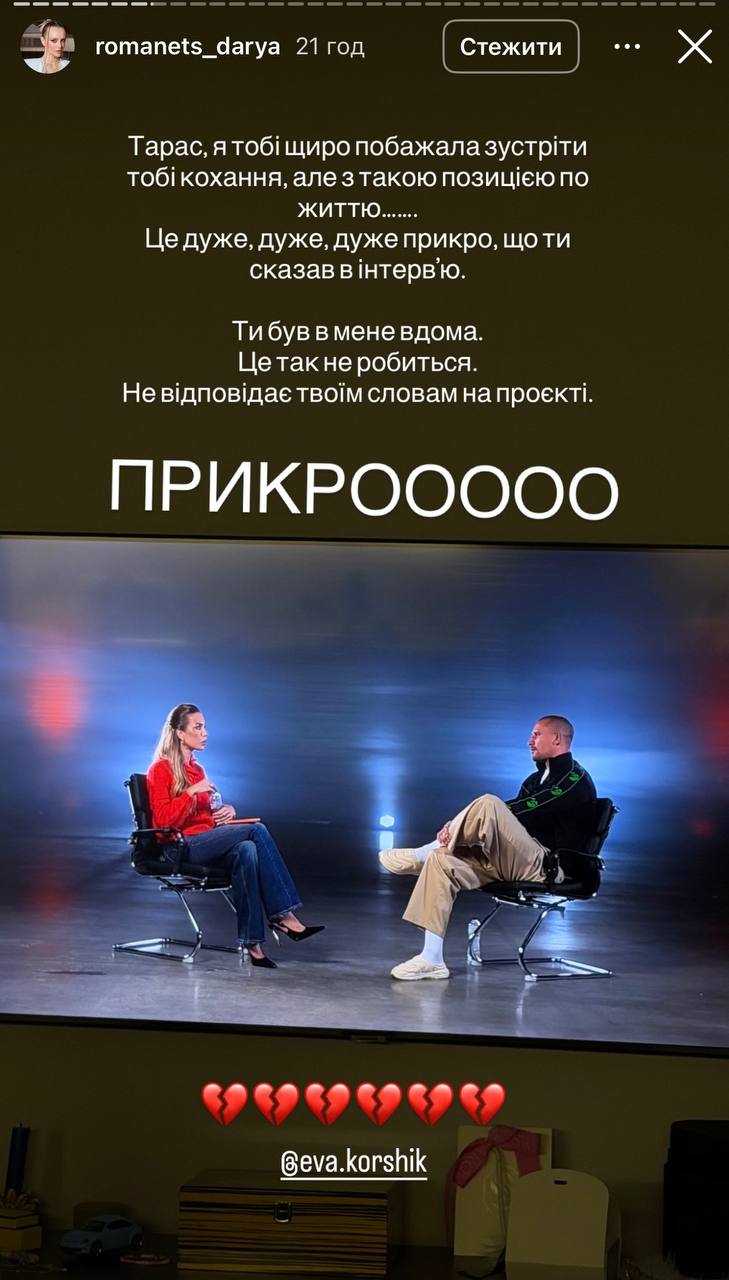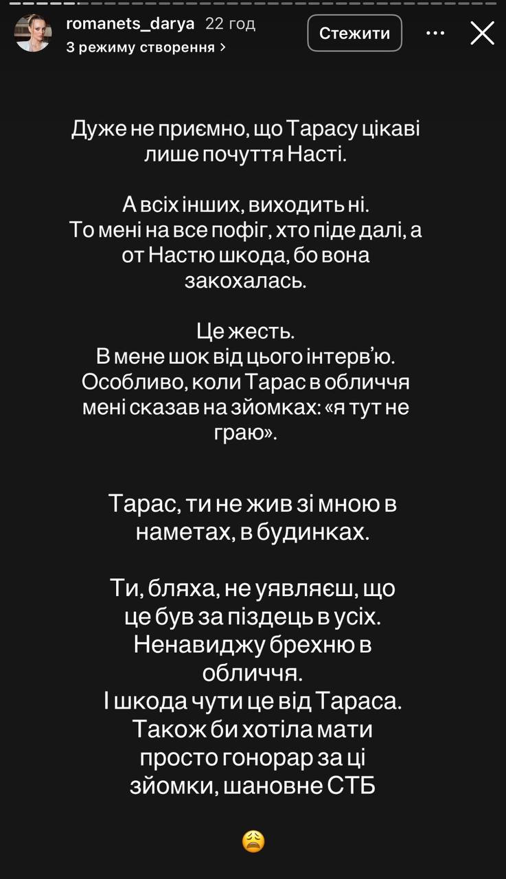 - Це жесть. В мене шок від цього інтерв’ю. Особливо коли Тарас в обличчя мені сказав на зйомках: «Я тут не граю». Тарасе, ти не жив зі мною в наметах, в будинках. Ти, бляха, не уявляєш, що це був за піздець у всіх. Ненавиджу брехню в обличчя. І шкода чути це від Тараса. Також би хотіла мати просто гонорар за ці зйомки, шановне СТБ, - написала Романець.