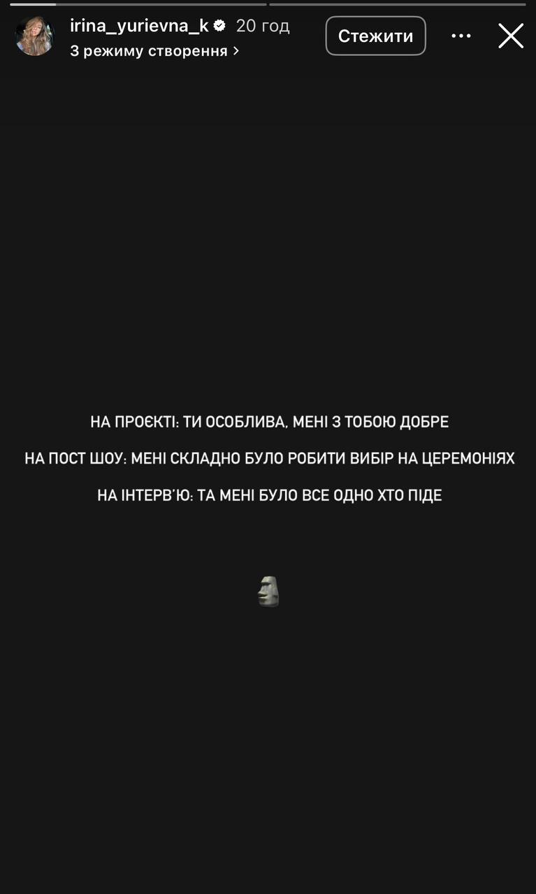 - На проєкті: "Ти особлива, мені з тобою добре". На постшоу: "Мені складно було робити вибір на церемоніях". На інтерв’ю: "Та мені було все одно, хто піде", - написала Ірина.
