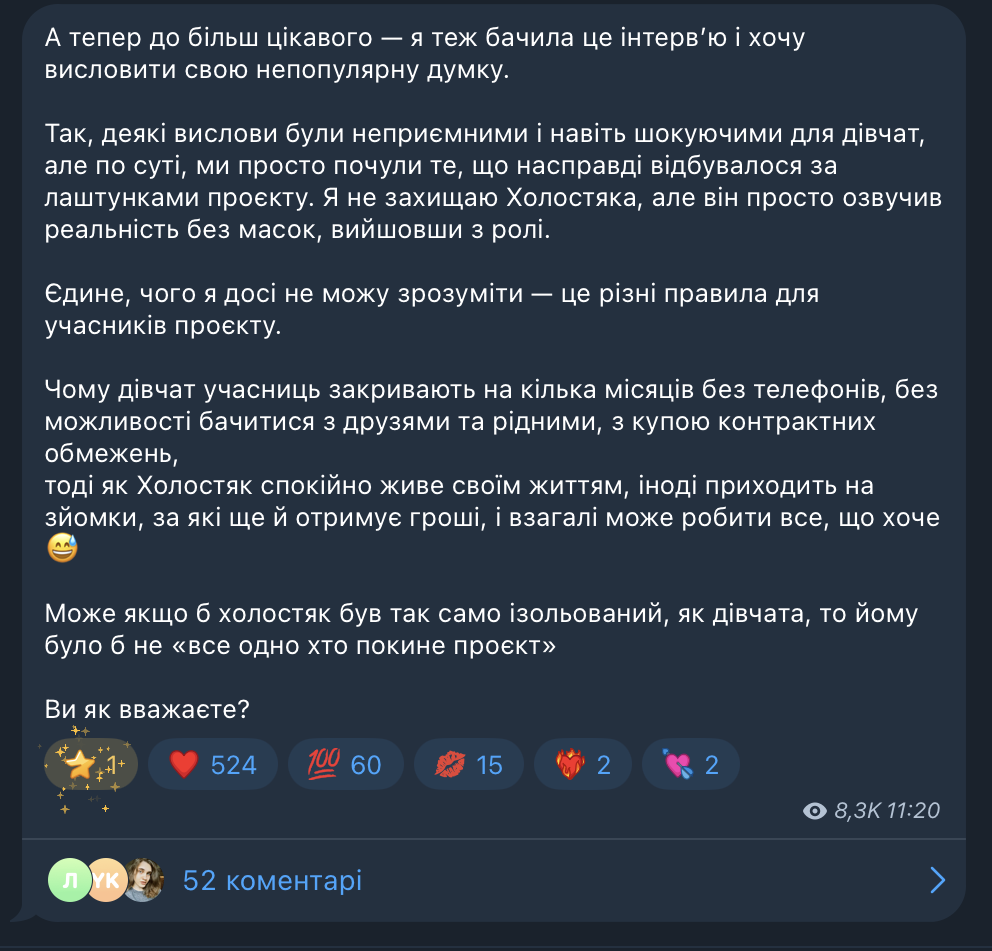 - Так, деякі вислови були неприємними та навіть шокуючими для дівчат, але, по суті, ми просто почули те, що насправді відбувалося за лаштунками проєкту. Я не захищаю Холостяка, але він просто озвучив реальність без масок, вийшовши з ролі. Єдине, чого я досі не можу зрозуміти, це різні правила для учасників проєкту. Чому дівчат-учасниць закривають на кілька місяців без телефонів, без можливості бачитися з друзями та рідними, з купою контрактних обмежень, тоді як Холостяк спокійно живе своїм життям, іноді приходить на зйомки, за які ще й отримує гроші, і взагалі може робити все, що хоче. Може, якщо б Холостяк був так само ізольований, як дівчата, то йому було б не «все одно, хто покине проєкт», - написала Зотова у своєму телеграм-каналі.