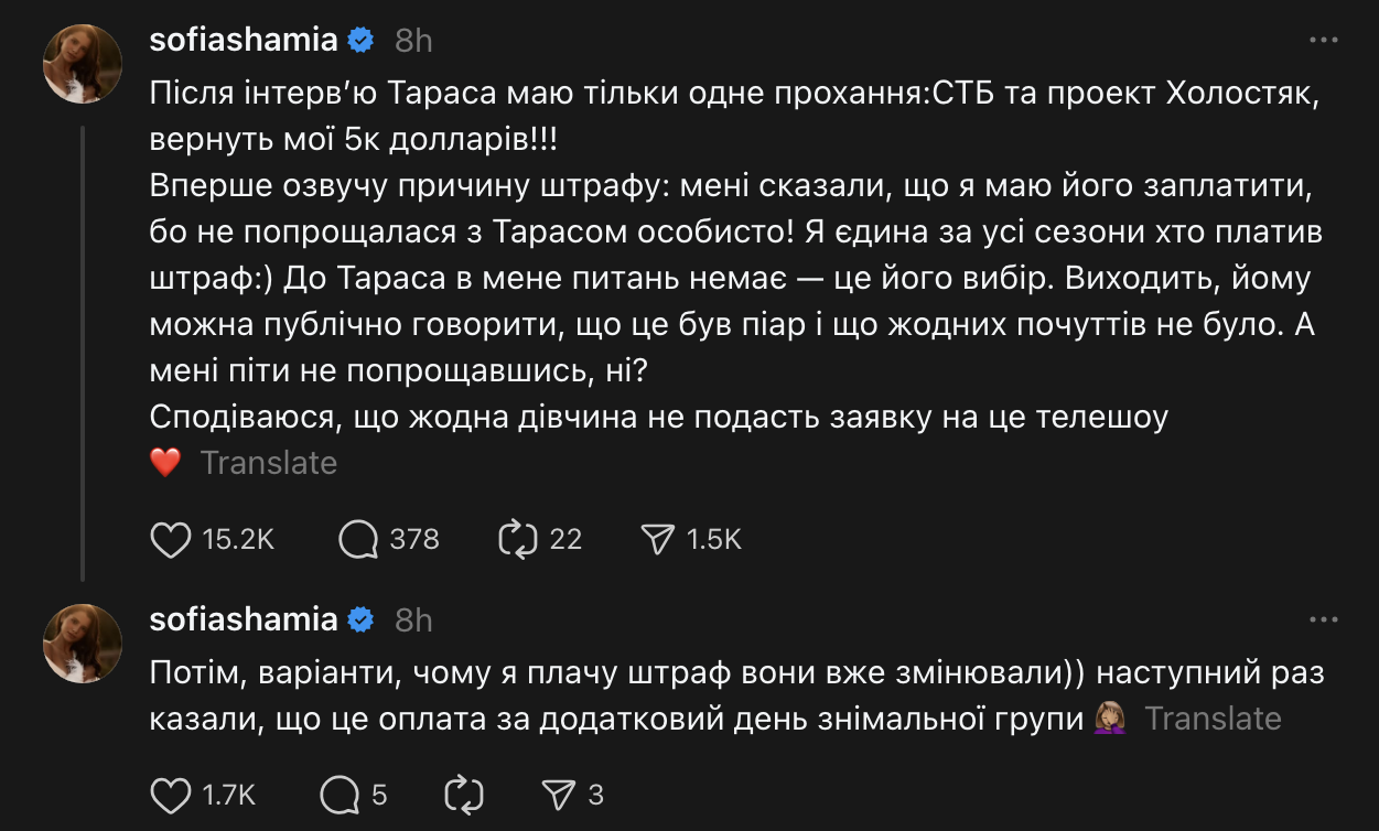 - Після інтерв’ю Тараса маю лише одне прохання: СТБ та проєкт "Холостяк", поверніть мої п'ять тисяч доларів! Вперше озвучу причину штрафу: мені сказали, що я маю його заплатити, бо не попрощалася з Тарасом особисто! Я єдина за усі сезони, хто платив штраф. До Тараса в мене питань немає - це його вибір. Виходить, йому можна публічно говорити, що це був піар і що жодних почуттів не було. А мені піти не попрощавшись, ні? - написала Шамія у Threads.
