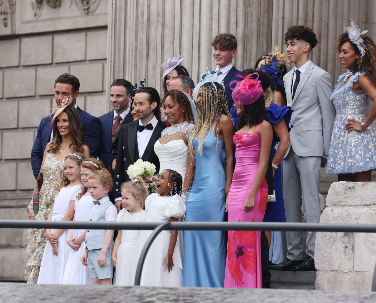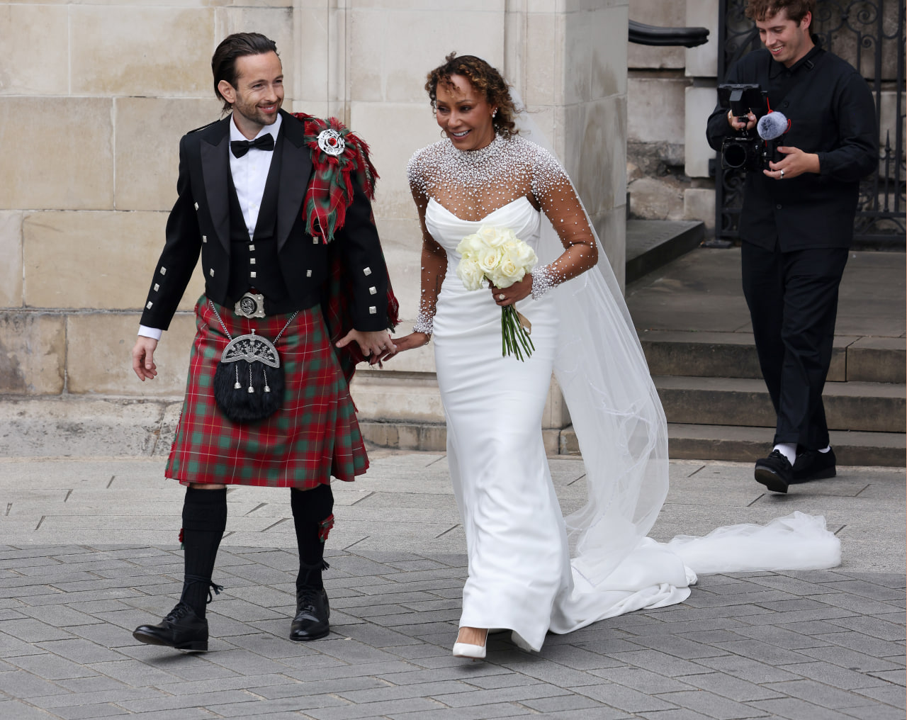 Весілля пари відбулося в соборі Святого Павла в Лондоні – у тій же церкві, де в липні 1981 року одружилися принцеса Діана та тодішній принц, а нині король Чарльз ІІІ. Це стало можливим завдяки тому, що у 2022 році виконавиця отримала від монарха звання члена Ордену Британської імперії за свою роботу із привернення уваги до проблем домашнього насильства. Три дочки Мел Бі були її подружками нареченої. Сама артистка пішла під вінець у весільному вбранні кольору слонової кістки від Josephine Scott, а потім переодяглася у сукню від дизайнера Джастіна Олександра. Наречений також вибрав оригінальне вбрання, з'явившись на весіллі у чорному піджаку з сорочкою та в шотландському кілті.