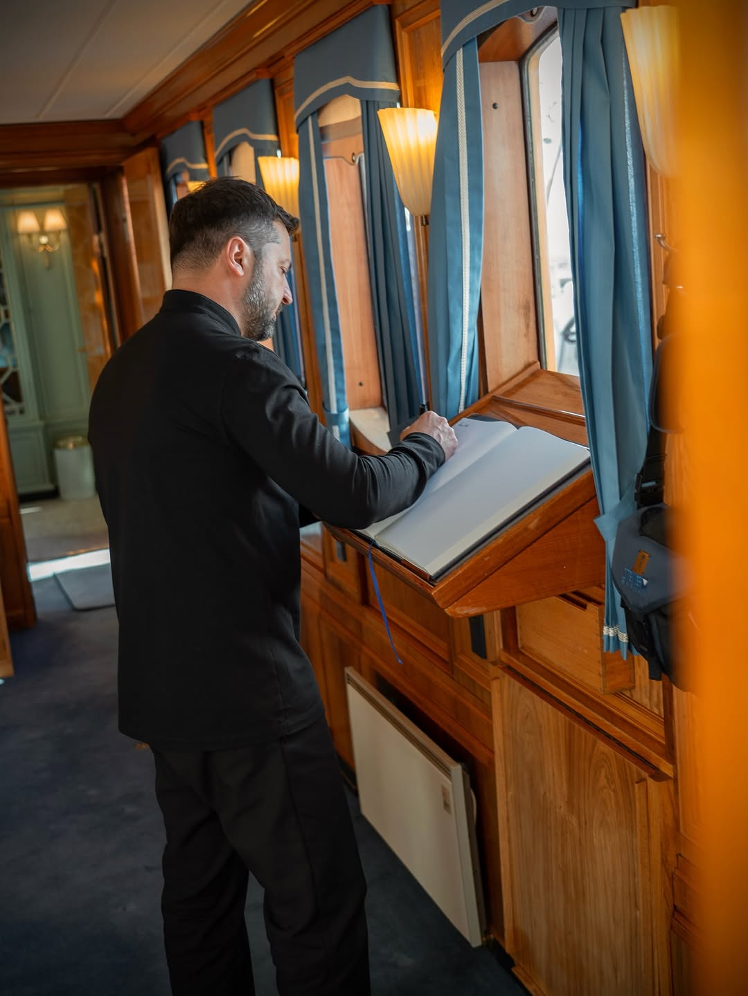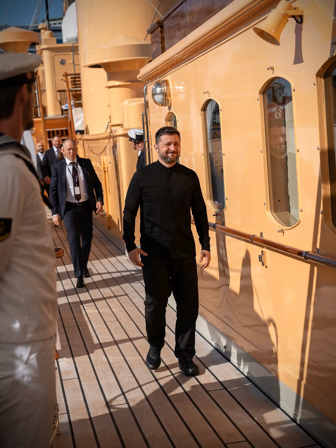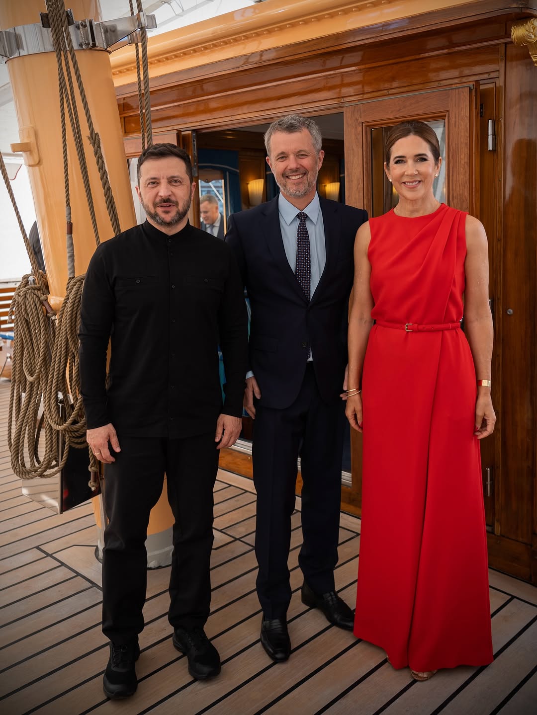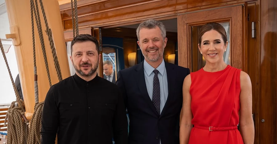 На зустрічі з монаршою сім'єю Зеленський з'явився в чорній сорочці і брюках. Зі свого боку королева Мері приміряла для вечері червону сукню з поясом в колір, а Фредерік Х - темно-синій костюм.