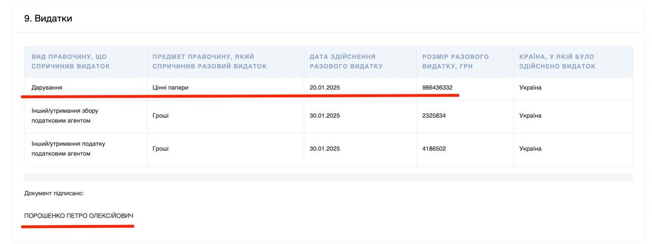 Експерт зазначає, що в кінці січня, за два тижні до санкцій, Порошенко вивів з України в іноземні папери 1 мільярд 48 мільйонів 635 тисяч гривень. Ще 986 мільйонів гривень, політик переписав шляхом дарування на невстановлену особу.