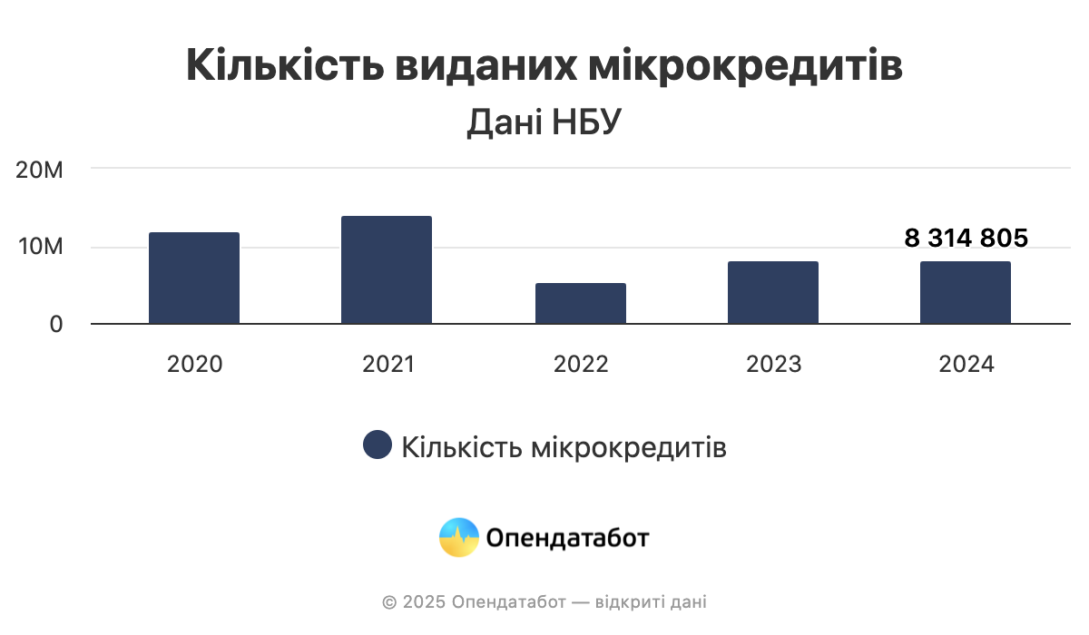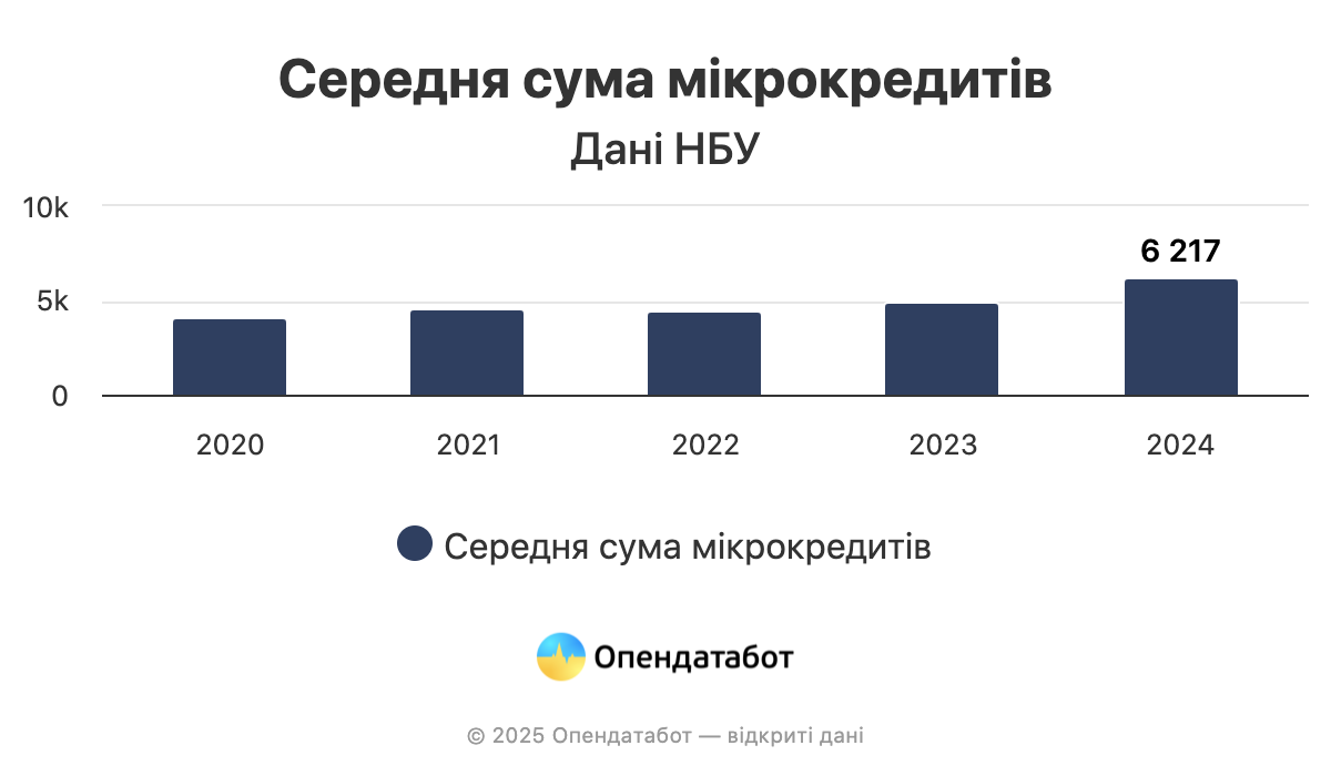 За 2024 рік українці оформили 8,3 млн мікрокредитів майже на 52 млрд грн, пише Опендатабот, посилаючись на дані Національного банку України. Це на 27% більше, ніж у 2023 році. Середня сума мікропозики зросла більш ніж на чверть: якщо у 2023-му середня сума складала 4926 грн, то торік вона вже була на рівні 6217 грн.