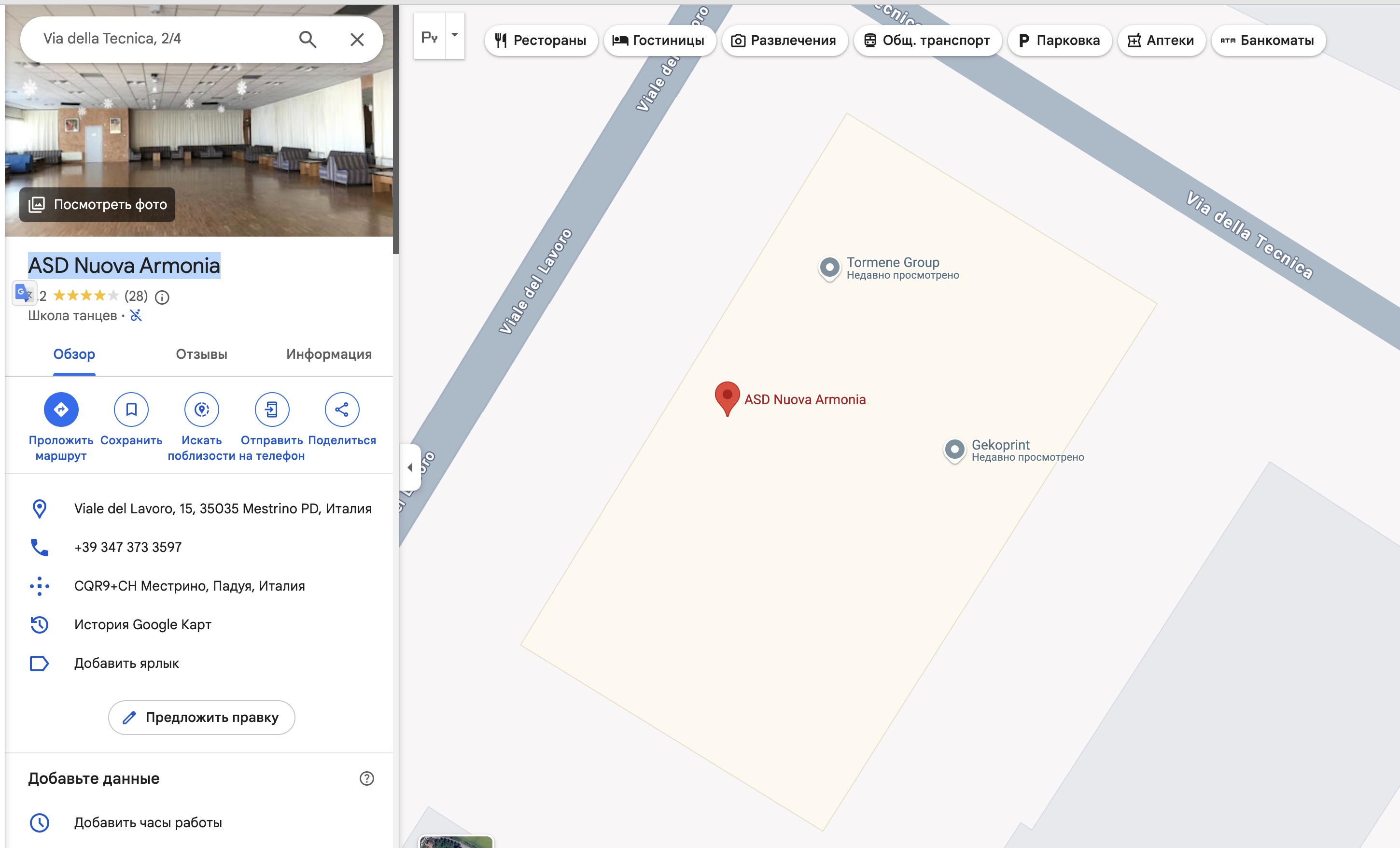 Більше половини приміщення за адерсою Via della Tecnica, 2/4, місто Местріно, регіон Падуя, Італія займає фірма по друку та школа танців «ASD Nuova Armonia!». А «виробник» Tormene Industriale S.r.l. – тільки невелику частину цієї будівлі.