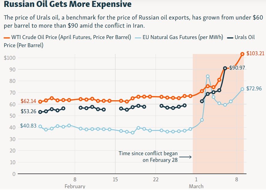 Війна в Ірані затягнулася і кардинально змінила ситуацію на ринку: лише за кілька днів ціна бареля нафти злетіла вище 100 доларів (86 євро). Російська нафта марки «Урал», яка тривалий час продавалася приблизно по 50 доларів, піднялась до рівнів, на які Москва ще кілька тижнів тому і не сподівалася. Кожне підвищення ціни на нафту на 10 доларів додає приблизно 0,7 відсоткового пункту до зростання російської економіки.