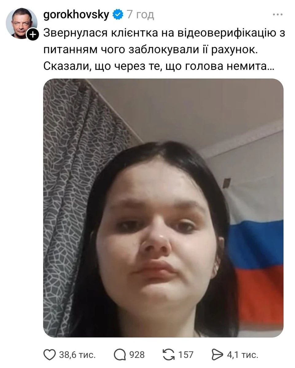 Історія почалася 9 березня, коли Гороховський опублікував фото клієнтки, зроблене під час її відеоідентифікації, та звинуватив її у проросійській позиції. Все через прапор, що висів за її спиною. Гороховський публічно розповів про інцидент і саркастично зазначив, що клієнтці відмовили в обслуговуванні "через немитий голову". При цьому пізніше сама дівчина вийшла на зв'язок і пояснила, що за кордоном, а за її спиною не прапор РФ, а прапор Словенії.