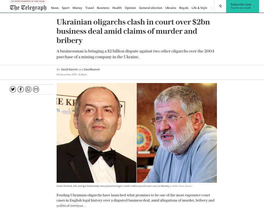 «Українські олігархи позиваються через бізнес-угоди на 2 мільярди доларів на тлі звинувачень у вбивстві та хабарництві», - говорила стаття в The Telegraph.