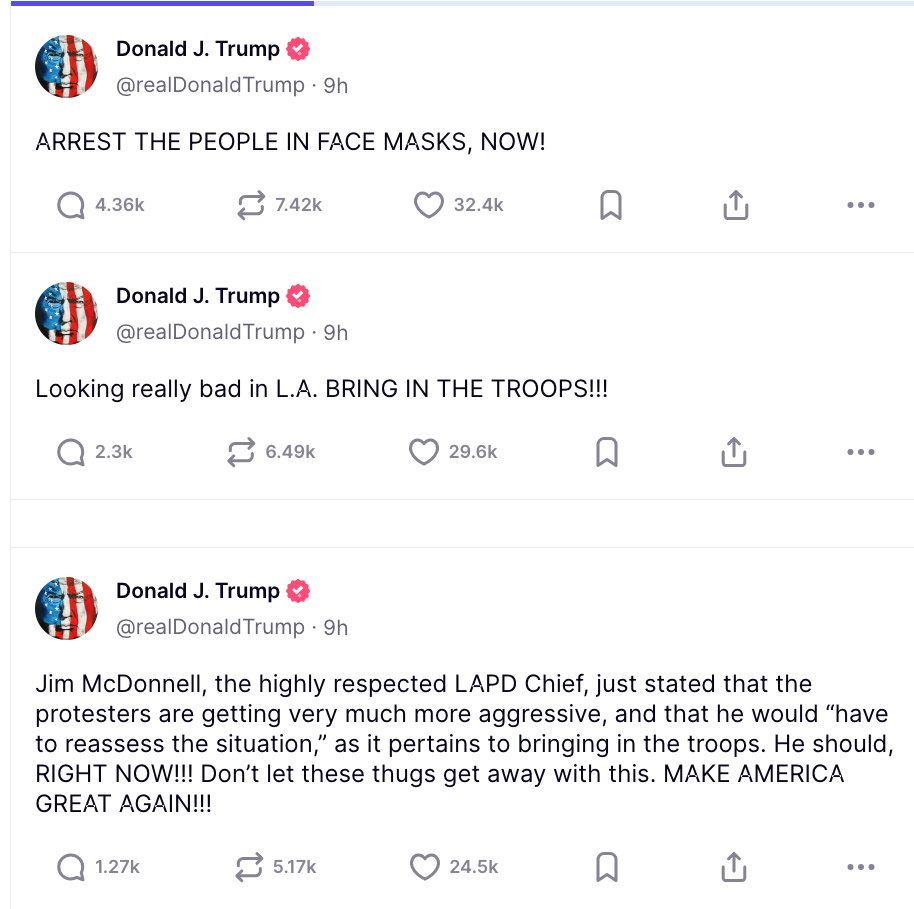 У неділю, 8 червня губернатор Каліфорнії Гевін Ньюсом назвав рішення Трампа про введення військ «навмисним підбурюванням». Мер Лос-Анджелеса Карен Басс засудила адміністрацію Трампа за провокування хаосу. Сам Дональд Трамп безапеляційно відповів у своїй соцмережі Truth Social і Ньюсому, і Басс у тому дусі, мовляв, якщо вони «не можуть виконати свою роботу», то федеральний уряд втрутиться та вирішить проблему з «заворушеннями і мародерами».