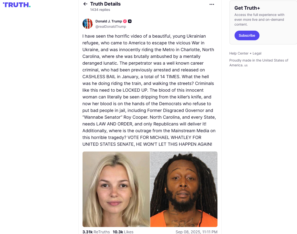 З небуття раптом виник Ілон Маск, який 7 вересня виступив на платформі Х із пропозицією: «Давайте змінимо закон, називаючи прокурорів та суддів, які дозволяють убивства, зґвалтування та пограбування». Також Маск підрахував, які ЗМІ розповіли про вбивство українки, а які промовчали чи обмежилися одним рядком. Стало зрозуміло, що висвітлення ситуації було нерівномірним, із чітким політичним поділом. Гучно говорили про інцидент праві та місцеві видання (Fox News, New York Post, Daily Mail, CNN, Newsweek, NewsNation, WCNC, Live5News та ін.), тоді як великі ліві національні ЗМІ в основному поки мовчать – це і The New York Times, і The Washington Post, і MSNBC.