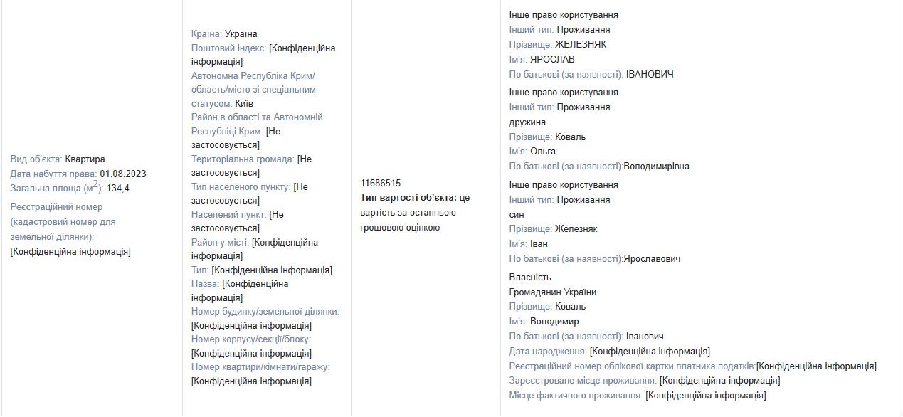 Народний депутат від партії «Голос», перший заступник голови Комітету ВР з питань фінансів, податкової та митної політики. Ярослав Железняк на другий рік повномасштабної війни задекларував нову квартиру у Києві, записану на тестя – Коваля Володимира Івановича. Площа квартири – 134 квадратних метри, а вартість – 12 млн гривень (це майже $280 000). У квартирі Железняк проживає разом з дружиною Ольгою Коваль (народна депутатка від партії «Слуга народа») та сином Іваном. Згідно даних реєстру нерухомості, мова йде про елітне житло на Печерську, а саме на вулиці Євгена Коновальця, 36-Б.