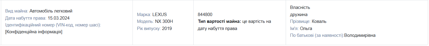 Того ж року Ольга Коваленко вказала, що володіє автомобілем преміум-класу Lexus Nx 300H (2019 року випуску), який до цього дружина нардепа орендувала протягом двох років.