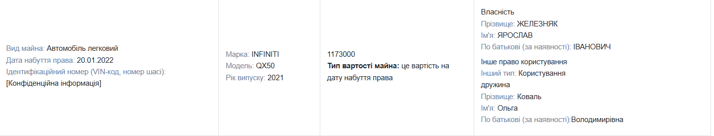 Також цікаво, що наприкінці січня 2022 року, коли українські та західні ЗМІ вибухали попередженнями про загрозу повномасштабного вторгнення РФ, Ярослав Железняк вирішив не втрачати можливість і придбав нове авто – Infiniti QX50 (2021 року випуску). Нардеп вказав, що такий автомобіль обійшовся йому у майже 1,2 млн гривень. До того ж Infiniti також користується його дружина, що на момент придбання становило у вартості майже 55 тисяч доларів.