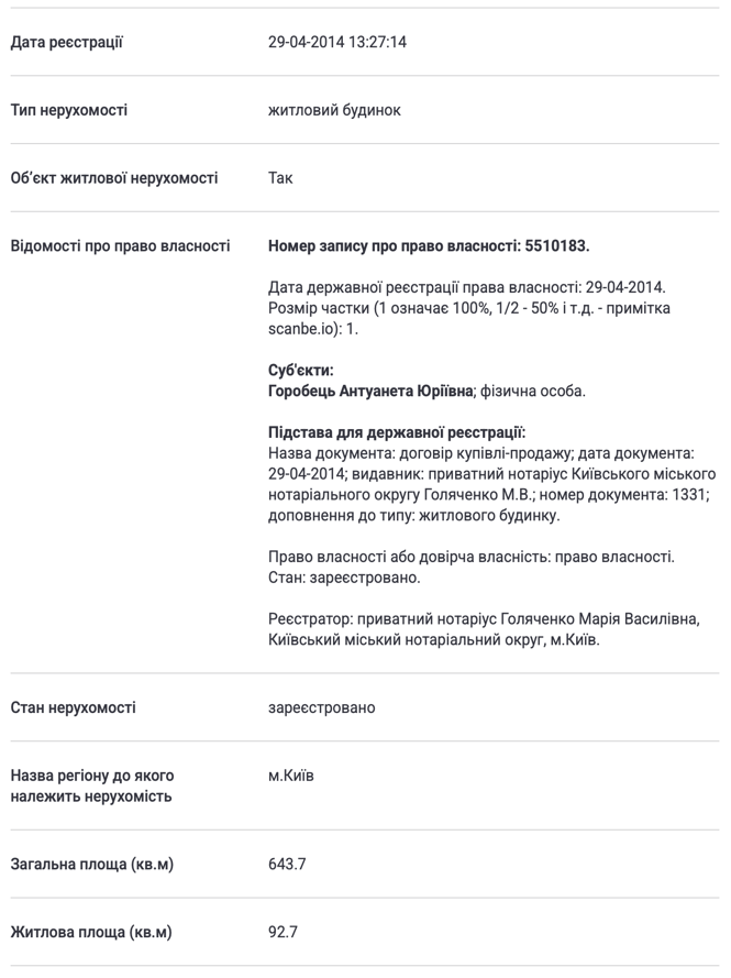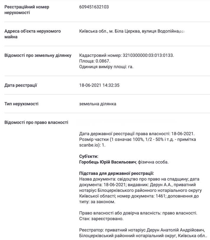 Також варто зазначити, що за період подружнього життя Железняка та Горобець її батько Юрій став власником трьох земельних ділянок у Білій Церкві, двох будинків площею 174 та 347 кв. м у Білій Церкві. А вже після офіційного розлучення колишній тесть Железняка придбав собі ще шість земельних ділянок у Білій Церкві.