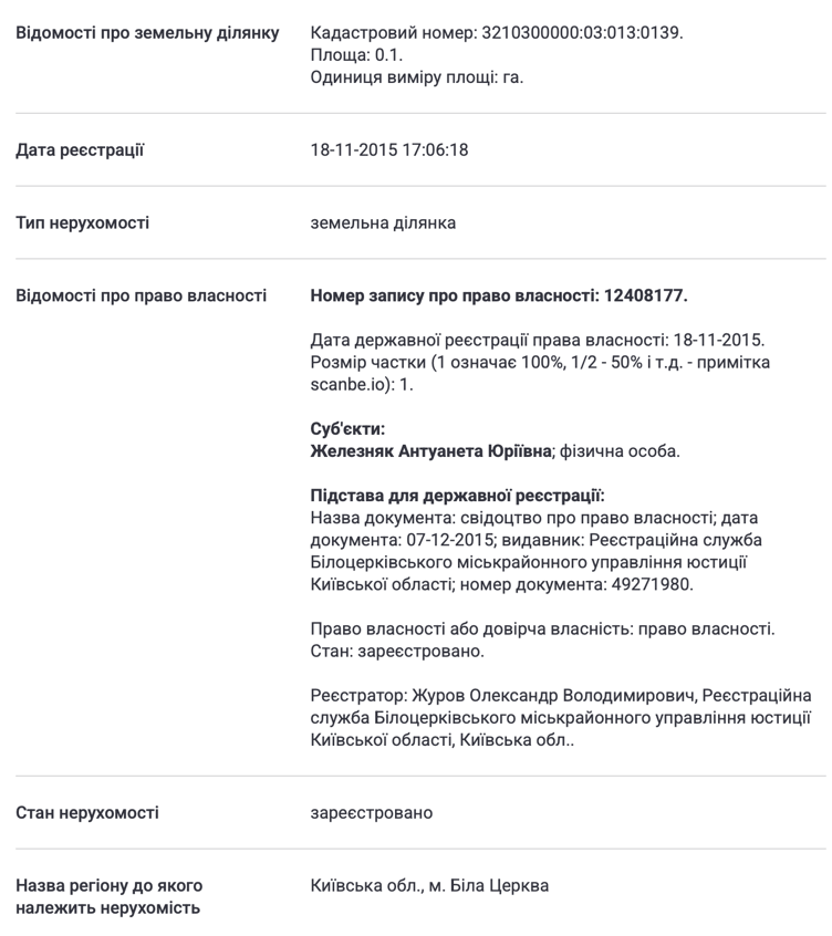 І е 18 листопада 2015 року дружина Железняка стала власницею будинку площею 920 кв. м у Білій Церкві.