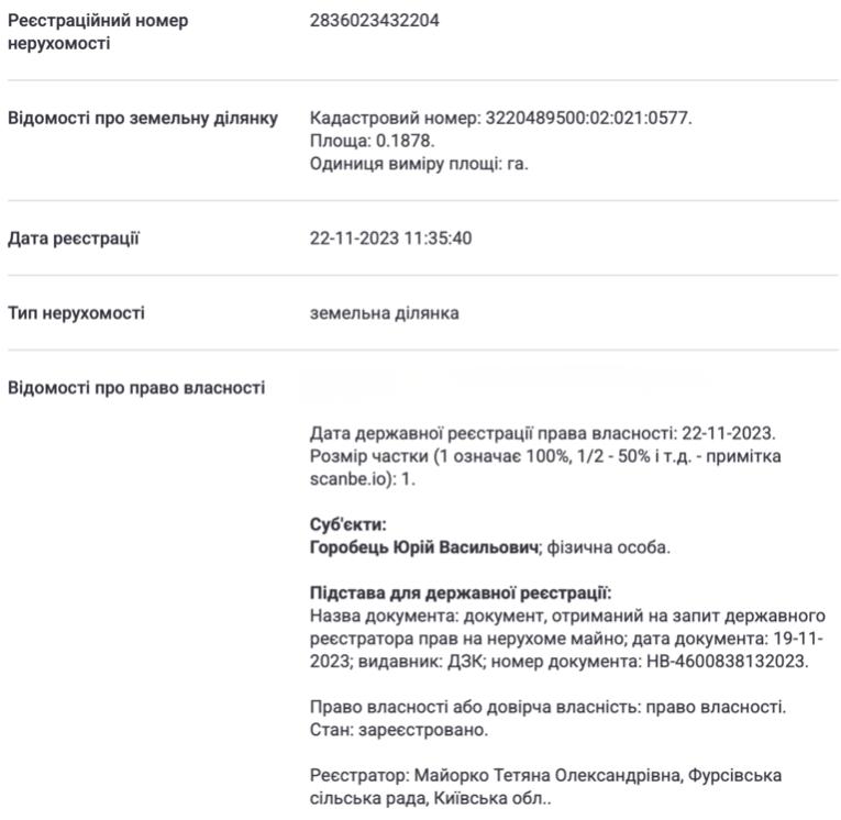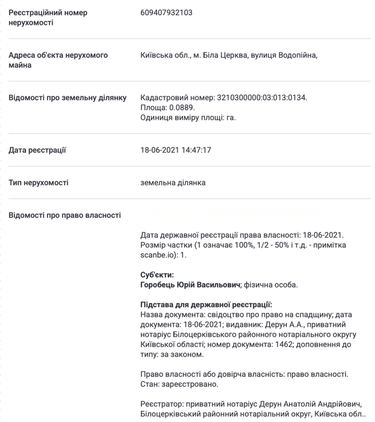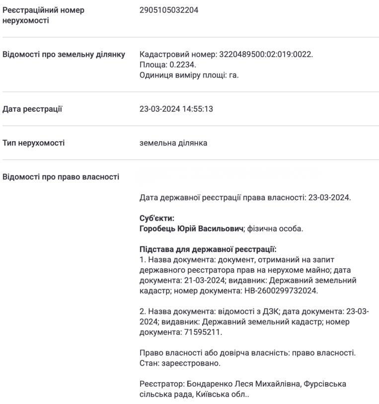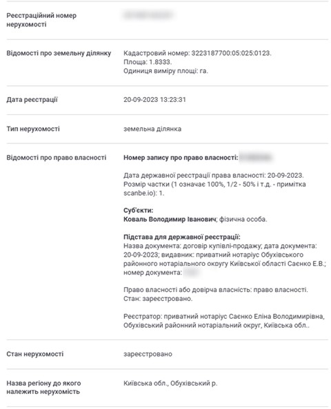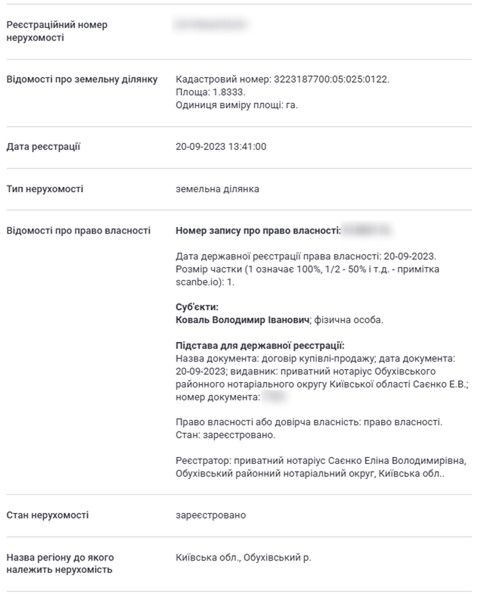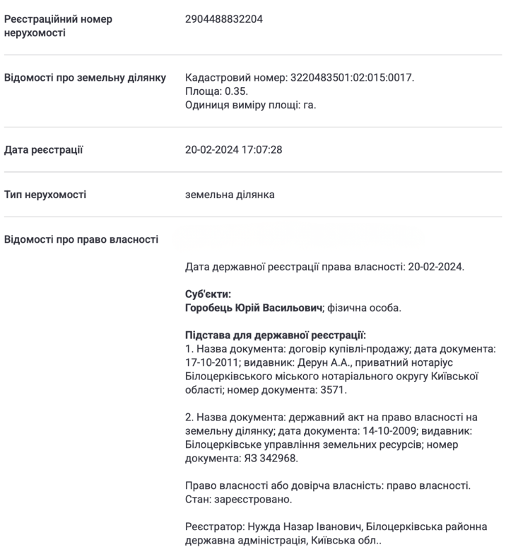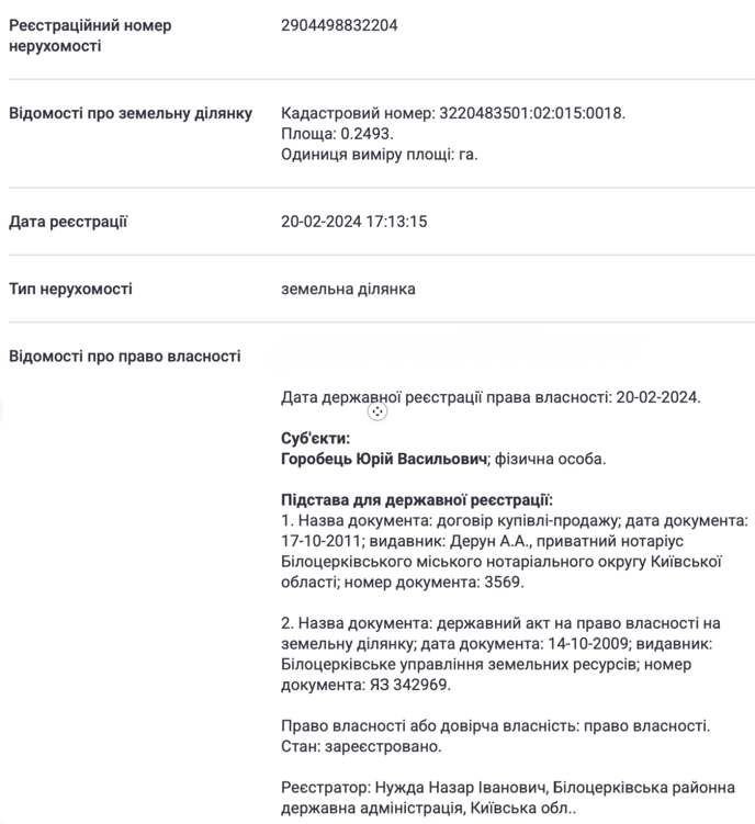 Крім цього, у вересні 2023 року тесть Железняка, Володимир Коваль, придбав одразу три земельні ділянки в Обухівському районі Київщини загальною площею 5,4 га.