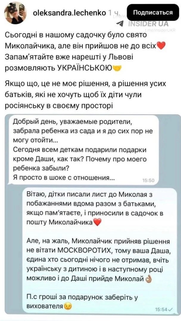 У соціальних мережах з’явився скриншот нібито з чату львівського дитсадка, у якому стверджувалося, що дитині не дали подарунок на День святого Миколая через те, що вона та її батьки написали лист російською мовою. Повідомлення є фейковим і в комунальних закладах Львова такої ситуації не було, повідомив директор департаменту освіти та культури Львівської міської ради Андрій Закалюк.