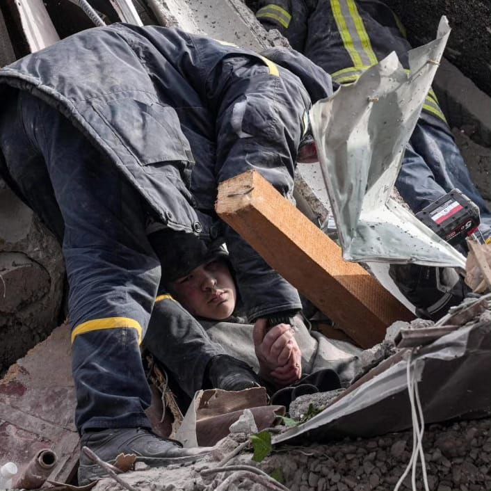 Страшні кадри: маріупольські рятувальники намагаються витягнути хлопця з-під завалів будівлі. Сам режисер фільму у закадровому тексті каже, що не знає, вижив хлопець чи ні – на його ноги впали кілька залізобетонних плит і на відео він не подає ознак життя.