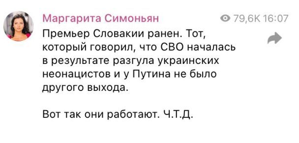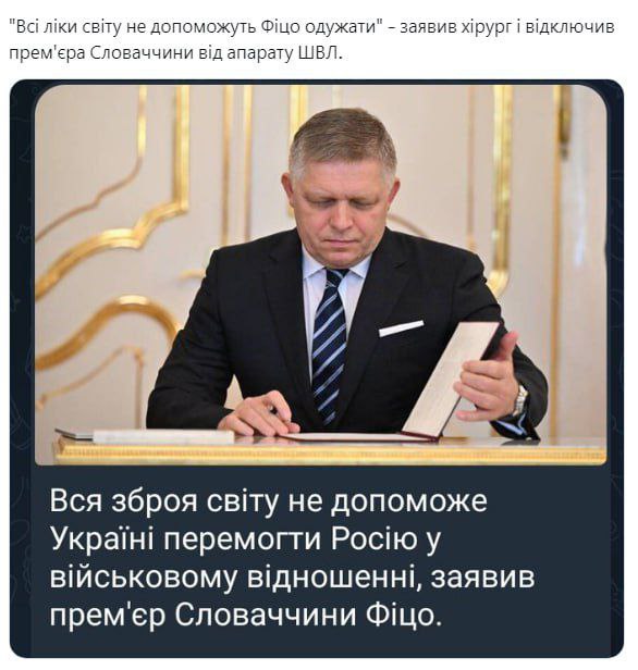 Варто накласти вето на будь-яку допомогу для Фіцо, щоб не розпалювати насильство. Нападника не можна перемогти, тож навіщо чинити опір. Крім того, Фіцо корумпований, неправильно буде витрачати на нього гроші платників податків. Нехай рятує життя, погоджується на умови нападника. Молитимемося за мир. (с) Михайло Литвиненко