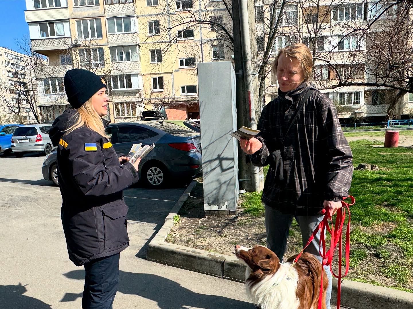 Патрульні обходять київські двори, розповідаючи про пожежну небезпеку та неправильне паркування. Фото: ФБ ДСНС Київ
