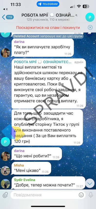 У Telegram з'являються групи, які обіцяють швидкий заробіток - від 500 до 3000 грн на день. Вони прикриваються брендами на кшталт Universal Pictures та пропонують фейкову «роботу» з TikTok. За легендою, потрібно виконувати прості завдання: підписуватися, ставити лайки, писати коментарі. Мовляв, ви допомагаєте просувати блогерів.