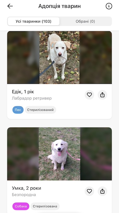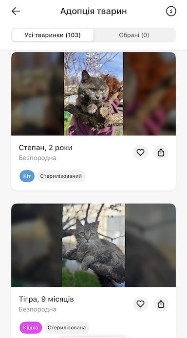 "Адопція тварин" доступна в розділі "Міські сервіси" в останній версії застосунку. Користувачі мають можливість переглядати фото котів та собак, ознайомлюватися з їхніми описами, додавати улюбленців до списку обраних і ділитися історіями тварин у соцмережах.