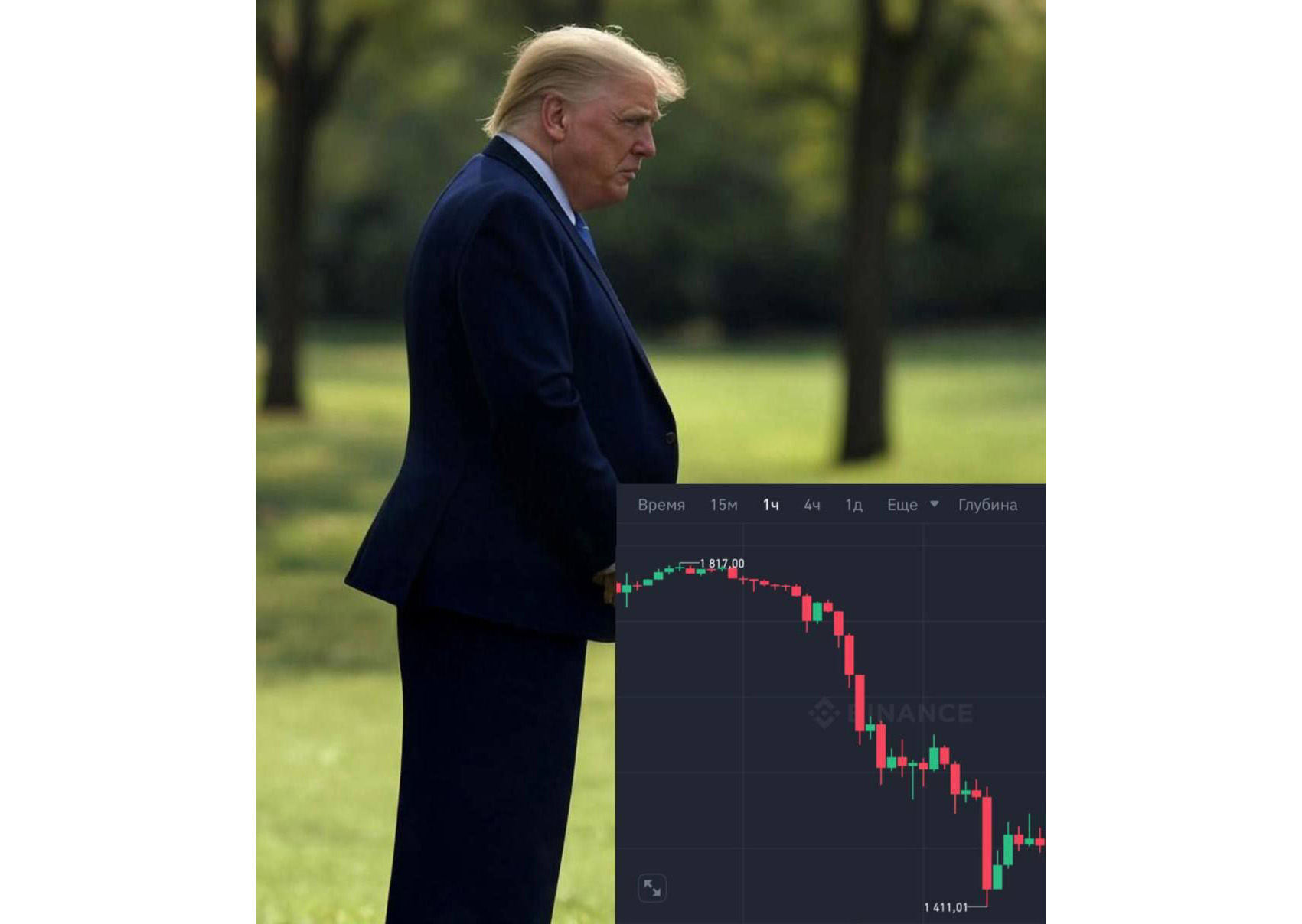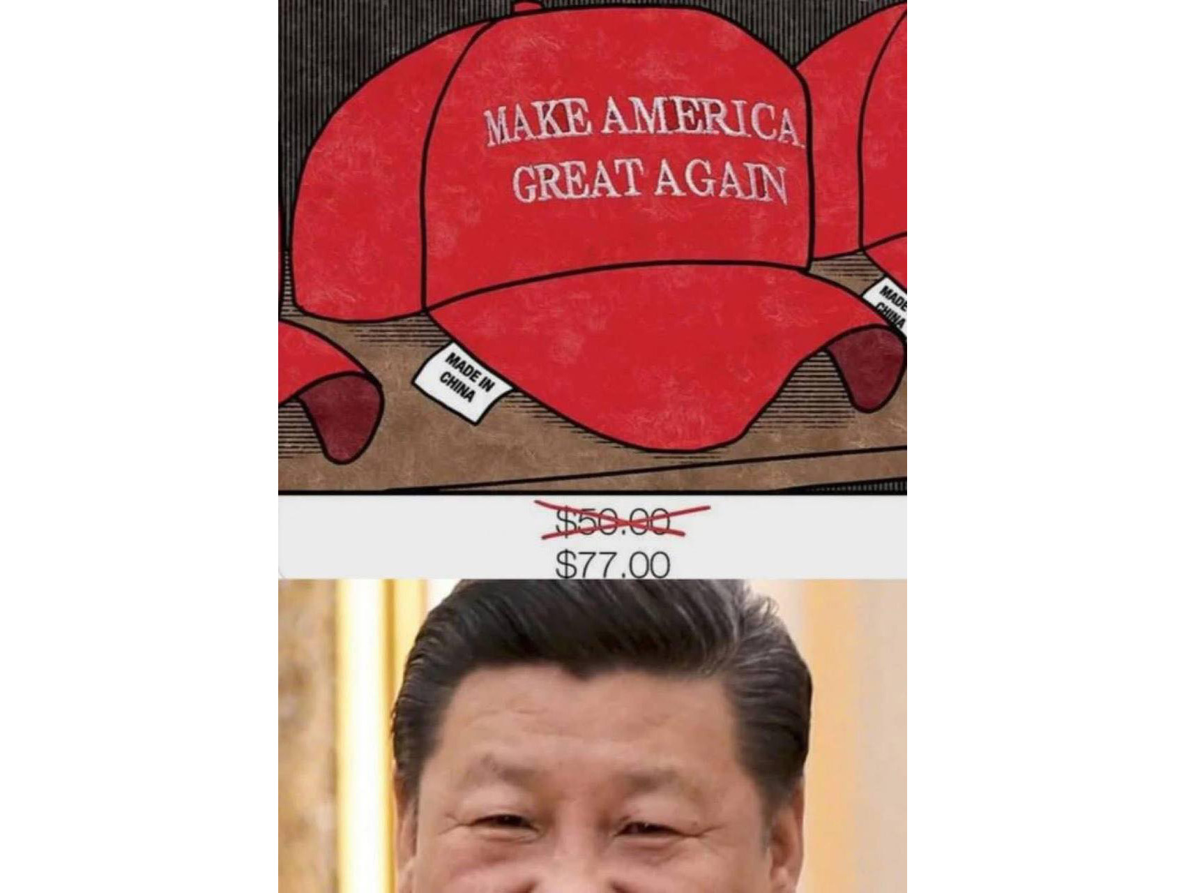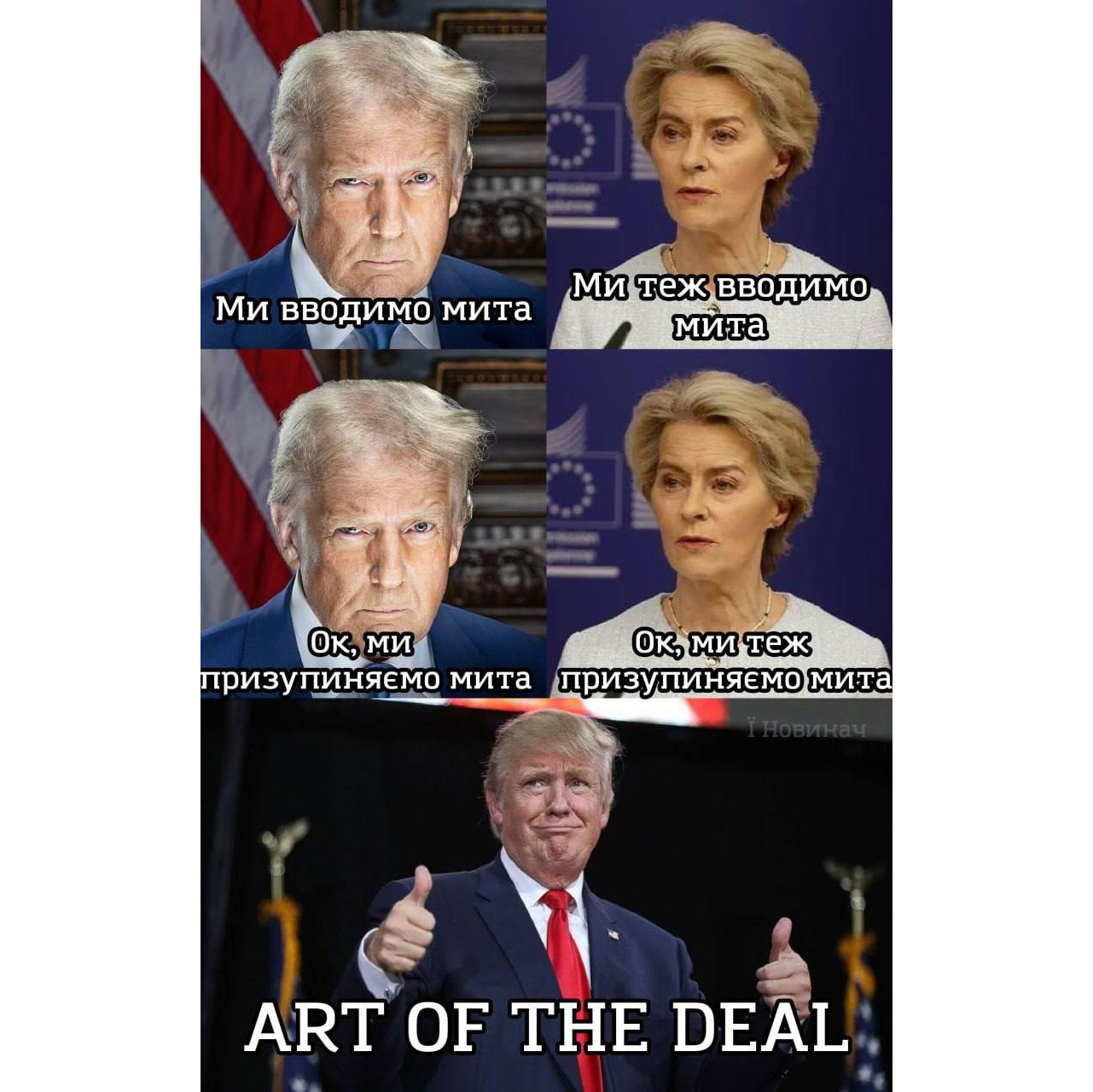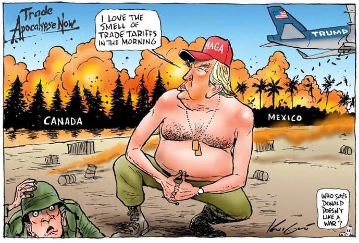 Торговий апокаліпсис сьогодні: «Люблю цей запах торгових мит зранку». В правому нижньому кутку: «Хто сказав, що Дональд не любить війни?»