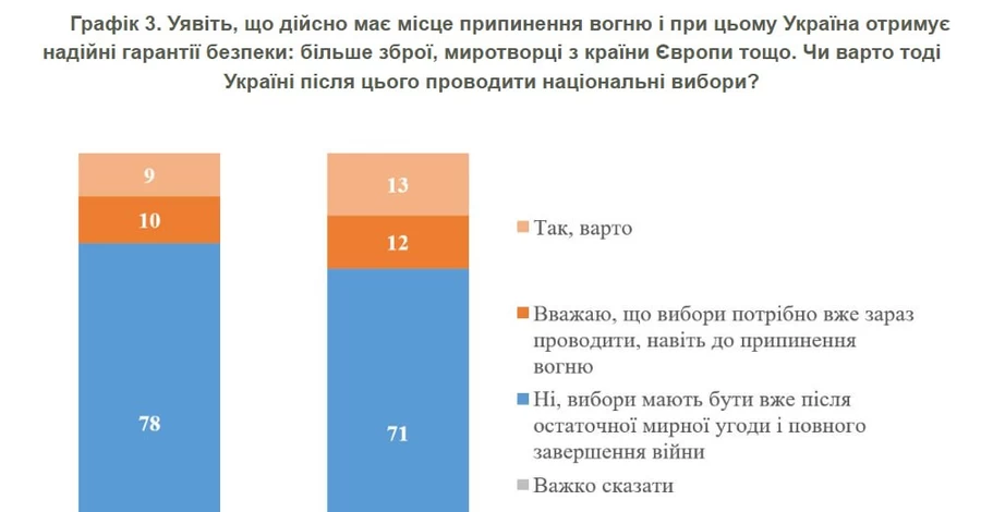 У порівнянні з березнем 2025 року дещо зросла кількість тих, хто підтримує ідею проведення виборів після встановлення перемир’я або навіть найближчим часом – з 19% до 25%. Проте частка громадян, які вважають, що вибори можливі лише після остаточного завершення війни, знизилася з 78% до 71%.