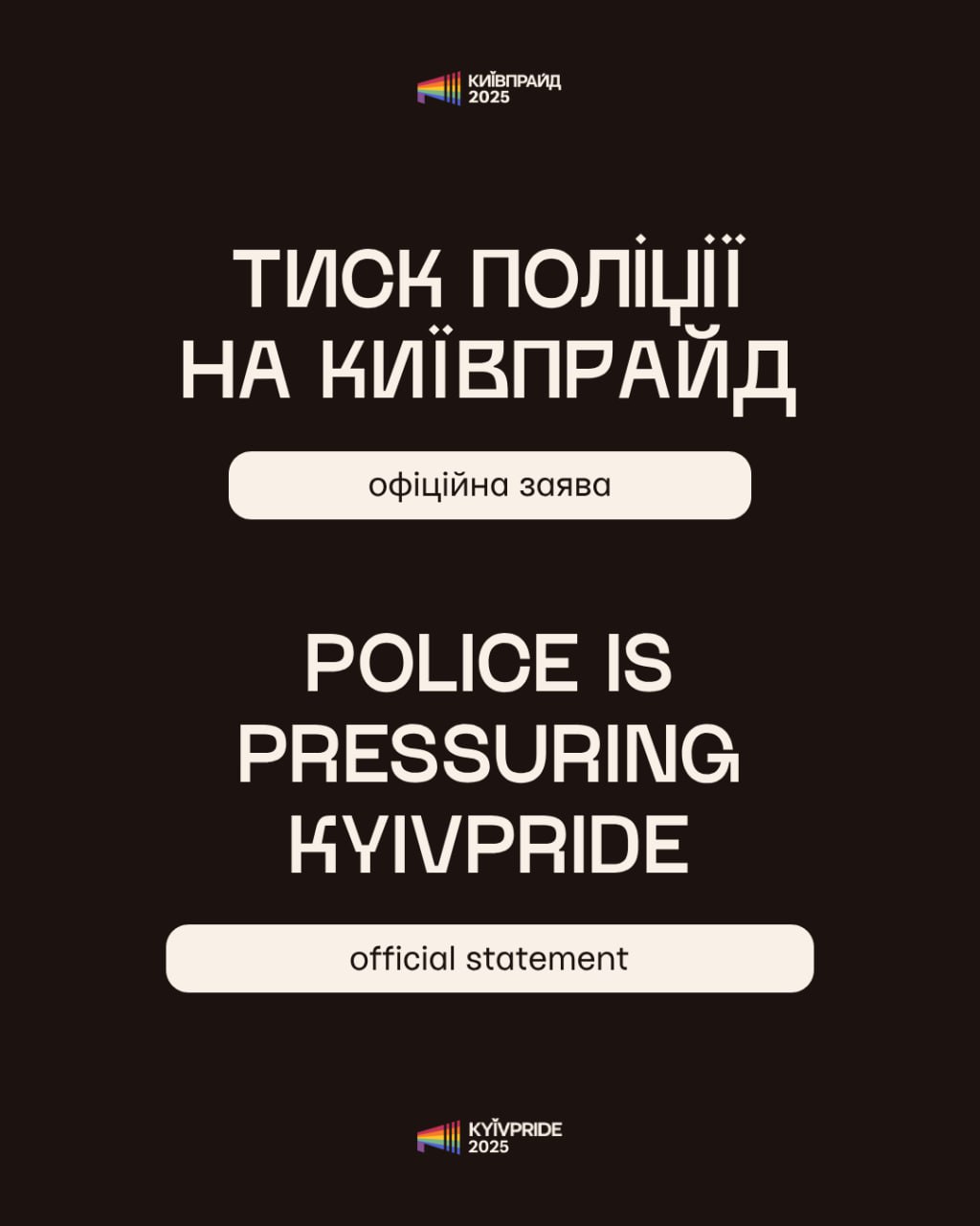 Громадська організація «КиївПрайд» заявила про перешкоджання у проведенні заходу на ВДНГ з боку Нацполіції. За даними команди, правоохоронці «замість сприяння у забезпеченні правопорядку намагаються протидіяти проведенню події».