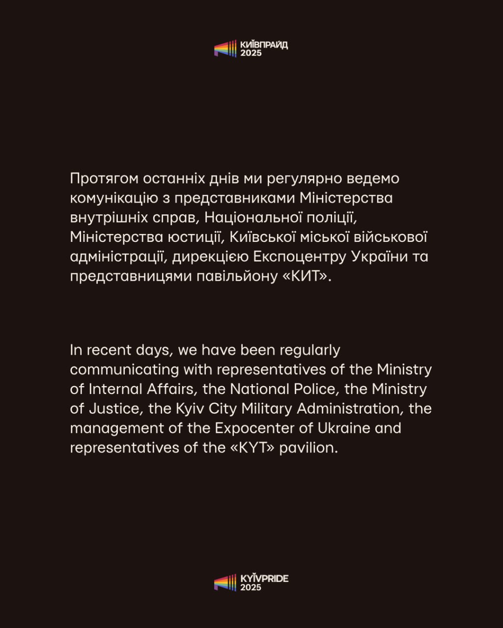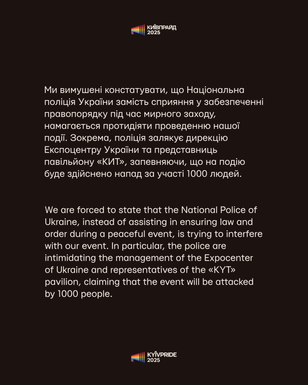 - Зокрема, поліція залякує дирекцію Експоцентру України та представниць павільйону «КИТ», запевняючи, що на подію буде здійснено напад за участі 1000 людей. Водночас в неофіційній розмові МВС повідомило, що їм відомо про загрозу теракту, якому вони не можуть ніяк запобігти, - йдеться у заяві «КиївПрайда».