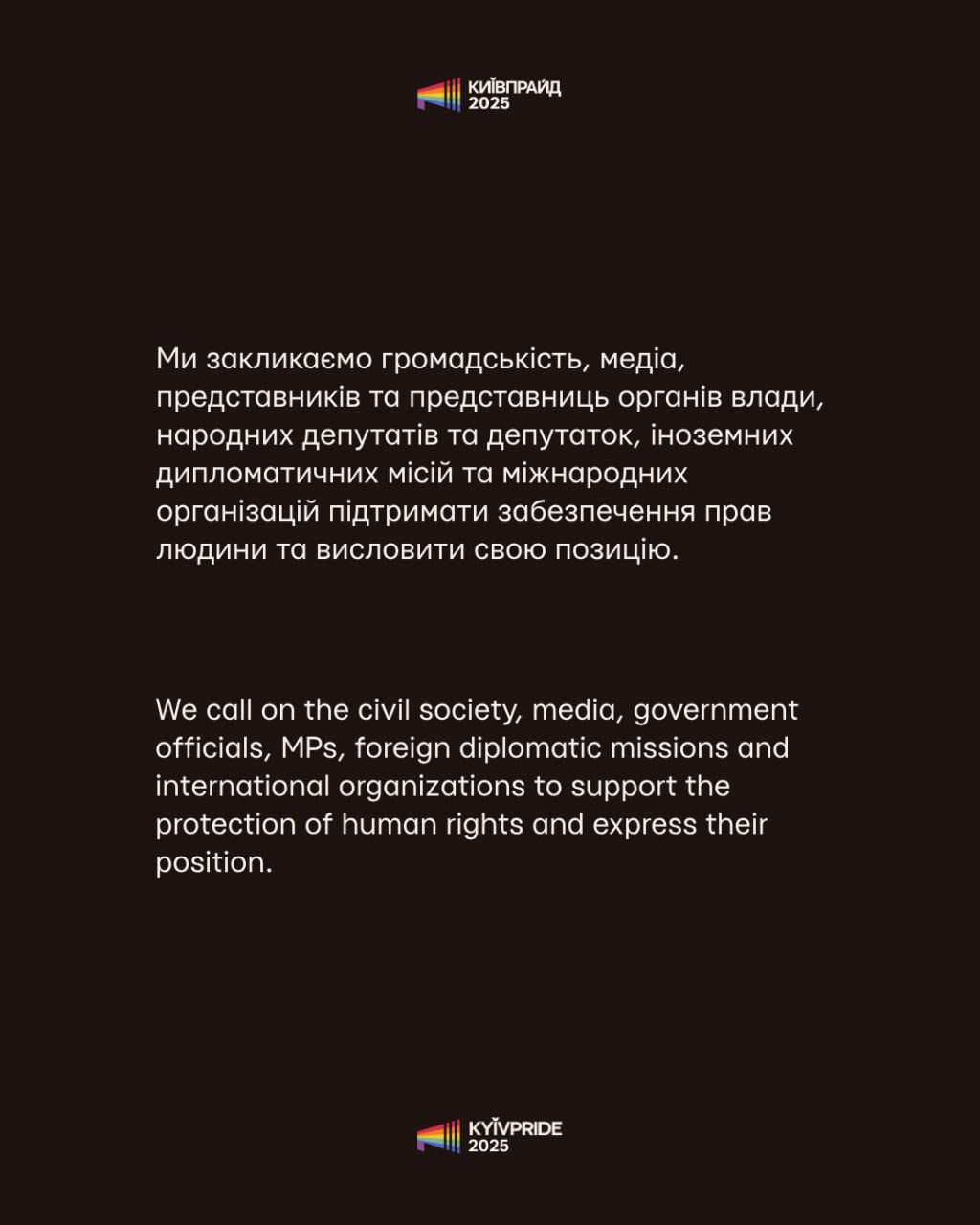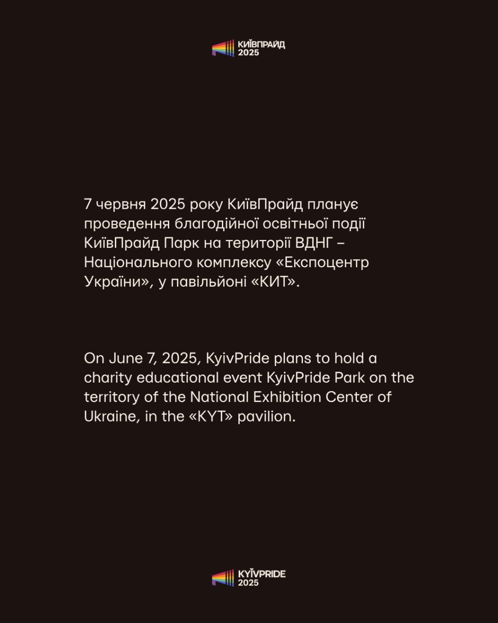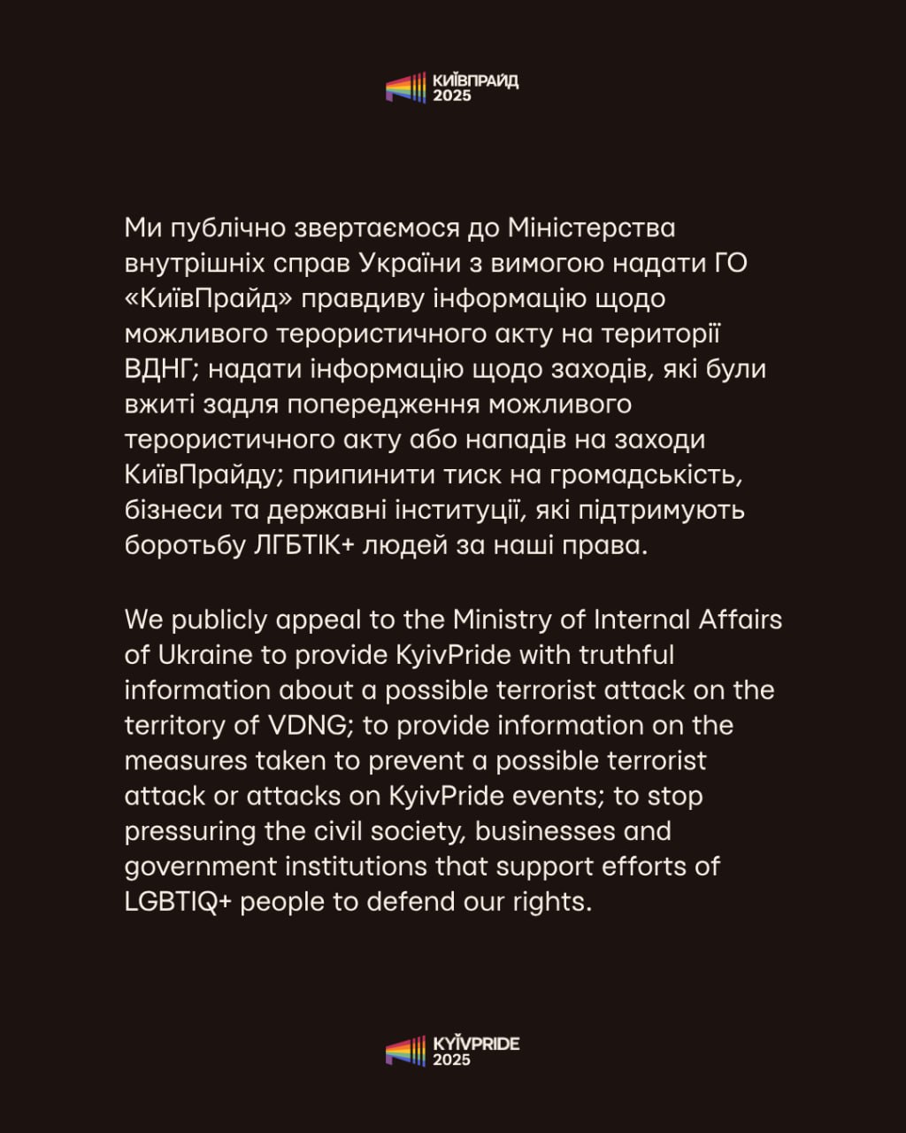 - Ми публічно звертаємося до МВС з вимогою надати правдиву інформацію щодо можливого теракту на території ВДНГ, надати інформацію щодо заходів, які були вжиті задля попередження можливого терористичного акту або нападів на заходи КиївПрайду, - наголосили в організації.