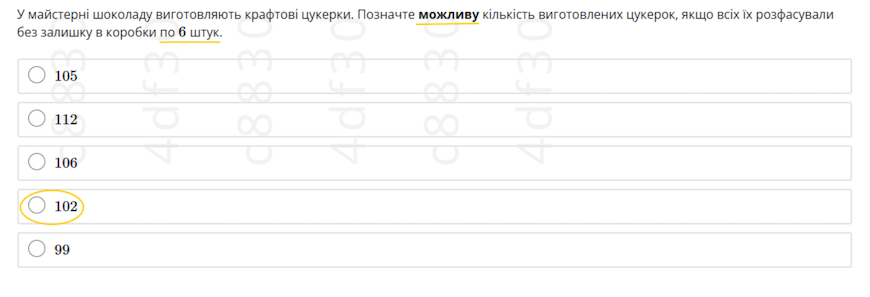 Як зазначають фахівці центру, завдання не лише практичне, а й досить просте. У його умові зазначено, що цукерки фасували по 6 штук, без залишку. Для розв’язання потрібно вибрати з варіантів число, яке ділиться на 6 без остачі. Такі завдання вперше зустрічаються у підручниках математики для 3 класу. Крім того, рішення можна спростити, застосувавши ознаки подільності на 2 і 3, які учні вивчають у 6 класі.
