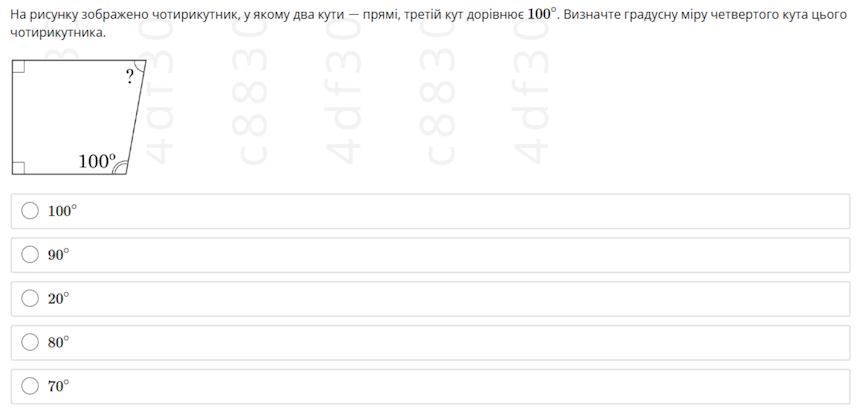 В умові чітко вказано, що чотирикутник має два прямі кути й третій кут дорівнює 100°. Враховуючи, що сума кутів будь-якого чотирикутника дорівнює 360°, отримуємо: 360° − 90° − 90° − 100° = 80°. Варто зазначити, що у «вільних переказах» умови, які з’являються у так званих «зливах» завдань, не згадується градусна міра кутів, а наведено лише рисунок.
