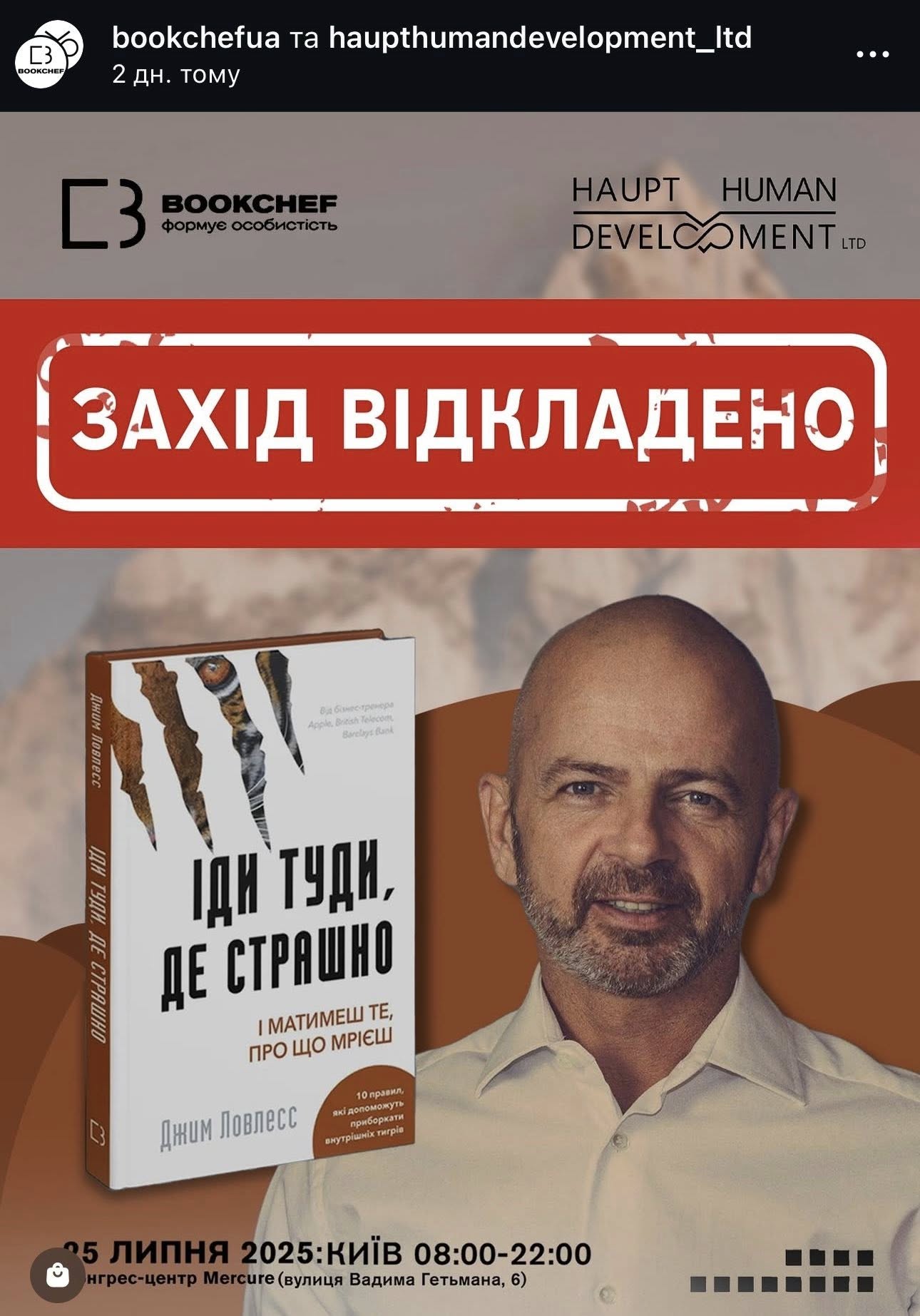 У Києві скасували виступ автора книги «Іди туди, де страшно» Джима Ловлесса. На це звернула увагу журналістка Лєна Чиченіна у своєму Facebook. Вона зазначила, що допис українського видавництва BookChef вже видалений та опублікувала його скриншоти, згідно з якими повідомлення опублікували два дні тому.