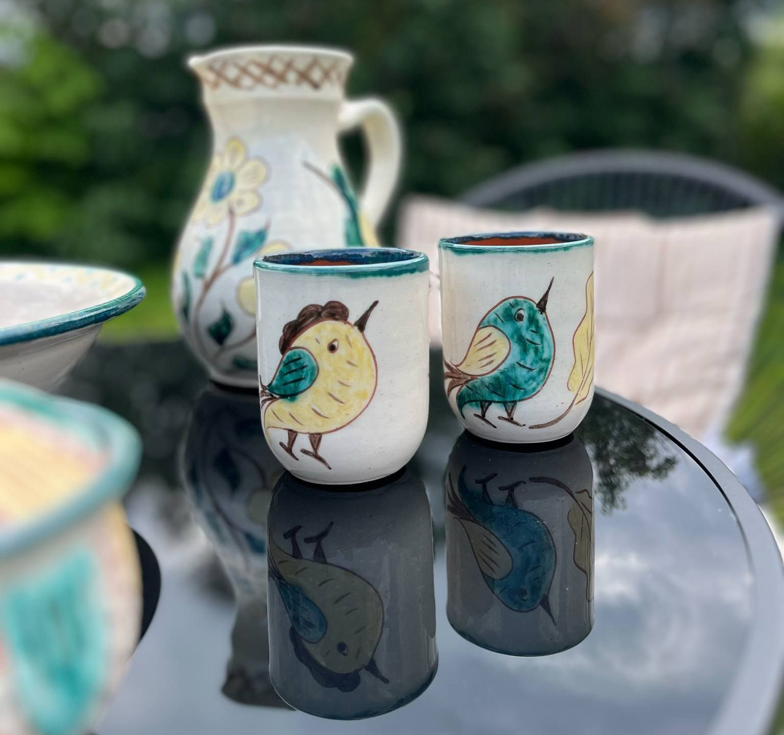 На виробах сокальської кераміки на білому фоні легкими мазками зображені птахи, квіти, особливі «розетки» у трьох кольорах (жовтий, зелений, коричневий). Фото: ФБ Сергій Івашків