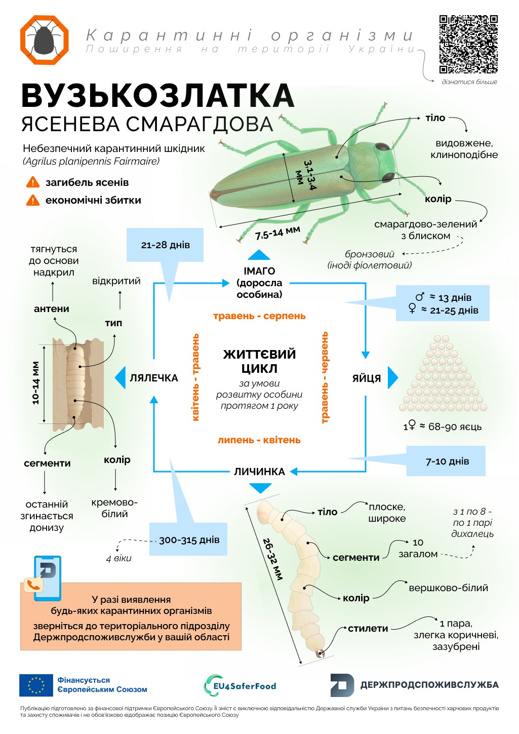 В Україні з’явилась загроза масового поширення вузькозлатки ясеневої (Agrilus planipennis) – карантинного шкідника, що призводить до загибелі ясеневих насаджень. Як повідомили у Держпродспоживслужбі, цей жук походить зі Східної Азії та потрапив до України з території Росії.