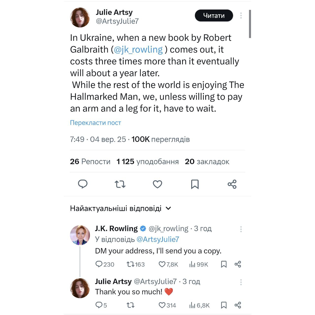 Українка поскаржилася в соцмережі X на те, що нова книга Роберта Гелбрейта (псевдонім Джоан Роулінг) у нашій країні коштує надто дорого. Письменниця оперативно відреагувала на пост дівчини, пообіцявши їй вислати примірник власноруч, пише телеграм-канал «Непозбувний книгочитун».