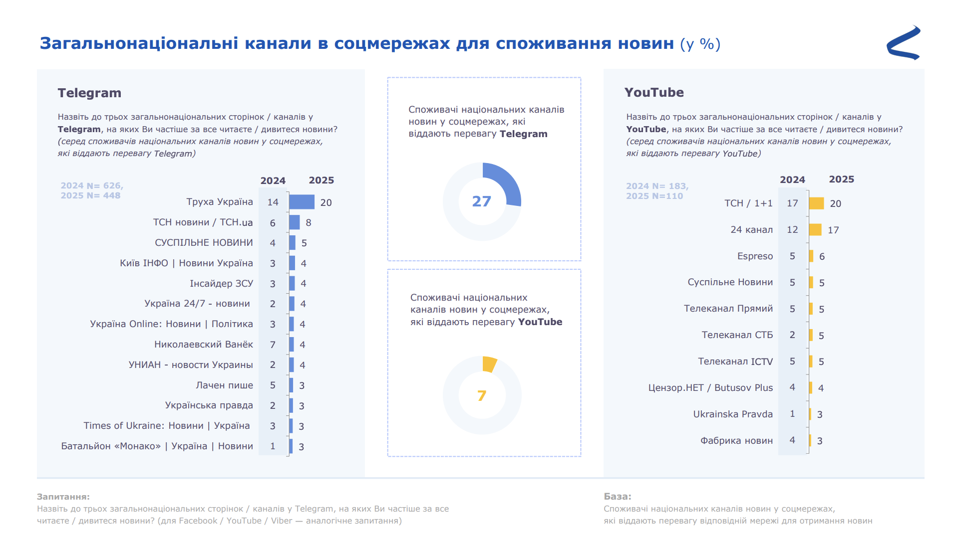 У Facebook та YouTube серед найпопулярніших новинних джерел переважають сторінки традиційних медіа: у Facebook лідирують «Суспільне Новини» та «Еспресо», а на YouTube - «ТСН / 1+1» та «24 Канал». Натомість у Telegram і Viber найчастіше читають канали «Труха Україна» та «Блискавка» відповідно.