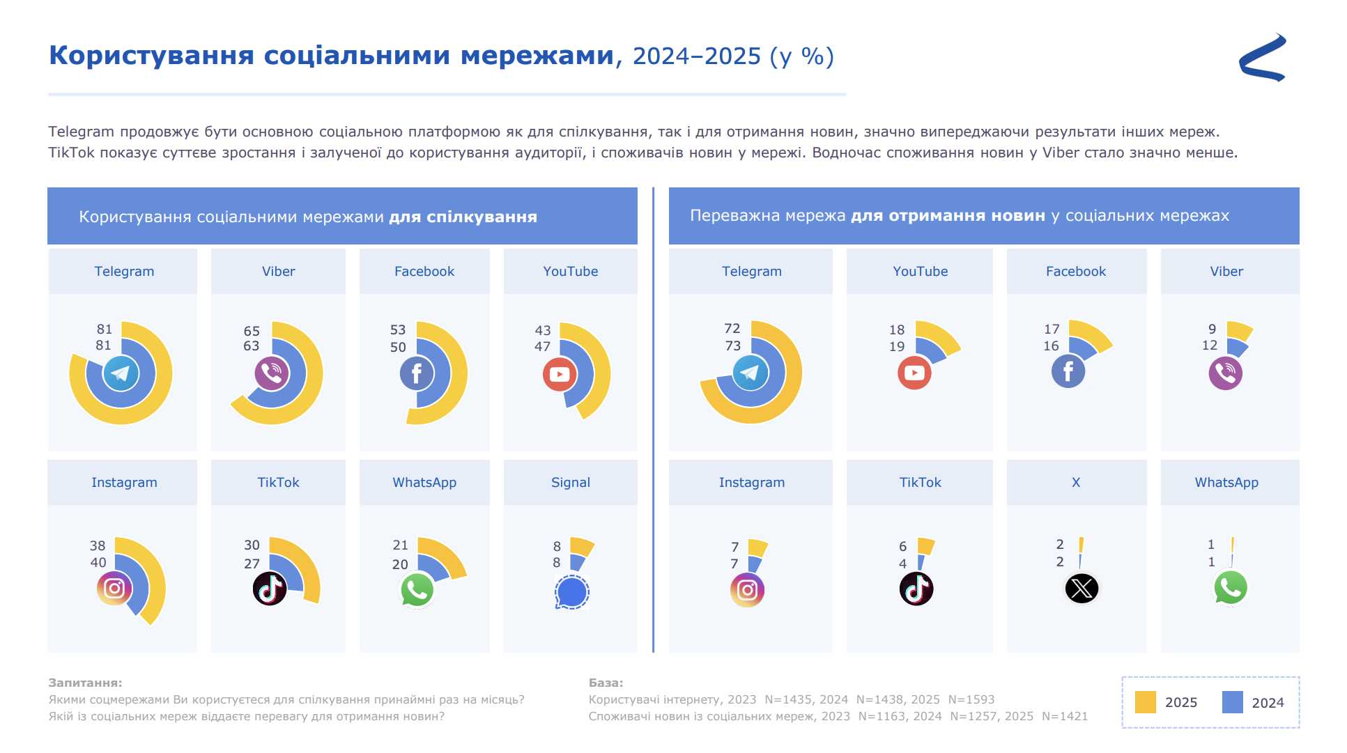 Соцмережі залишаються єдиним типом медіа, що нарощує популярність як джерело новин. У 2025 році ними користувалися 86 % українців (+35 % з 2015). Телебачення втратило аудиторію з 85 % до 33 %, новинні сайти - з 47 % до 31 %, радіо - з 35 % до 13 %, друковані видання - з 31 % до 4 %. Для 37 % соцмережі - єдине джерело новин, а 51 % поєднує кілька каналів.