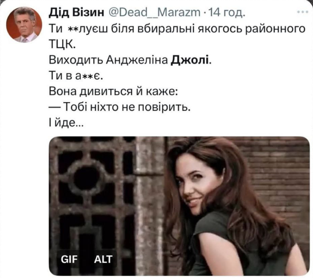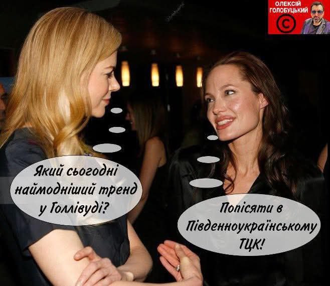 Не встигли українці обговорити три тисячі кілометрів, які вони повинні, вибачте, можуть проїхати безкоштовно «Укрзалізницею» в непікові періоди, як нова тема для мемів та обговорення – до Херсону приїжджала сама Анджеліна Джолі, акторка та посол ЮНІСЕФ. Чого приїжджала – точно невідомо, але обговорювали інше: працівники ТЦК на СП Миколаївщини затримали одного з її супроводжуючих, оскільки він є резервістом. Потім були кадри з ТЦК, куди Джолі нібито прийшла визволяти хлопця. У військкоматі не знайшли кращої відмовки, ніж сказати, що акторка заходила до них… у вбиральню. Тож замість того, щоб захоплюватись мужністю голівудської актриси – українці більше висміювали її контакт з українськими військкоматами.