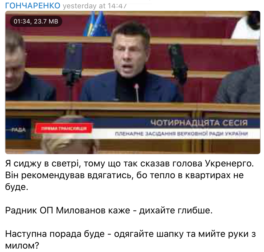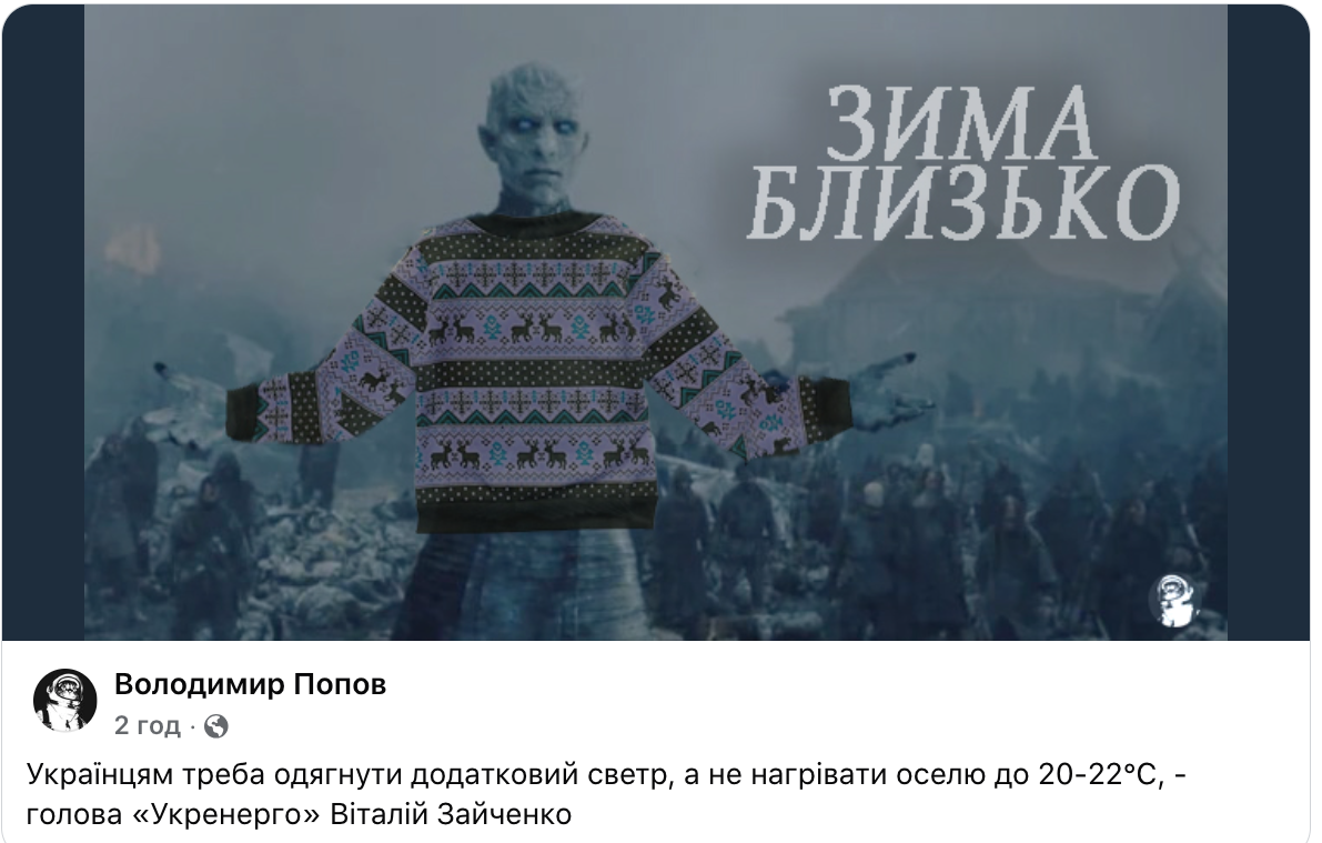 Голова Укренерго Віталій Зайченко звернувся до українців зі словами: «Потрібно не доводити температуру в приміщеннях до максимально комфортних 20–22°C, а вдягнути додатковий светр і цим допомогти нашій енергосистемі впоратися з тими викликами, в яких ми працюємо».