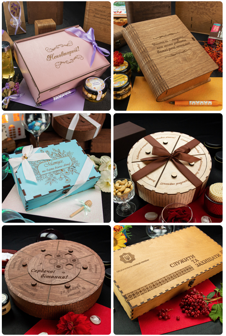 Зараз ми трохи переформатували подачу та рухаємось у бік створення подарункових наборів. Це можуть бути маленькі коробочки вартістю близько 200 гривень, а можуть бути великі персоналізовані великі упаковки з дерева вартістю 7-8 тисяч гривень. Також ми робимо кастомізовані вироби на замовлення.