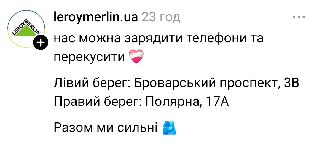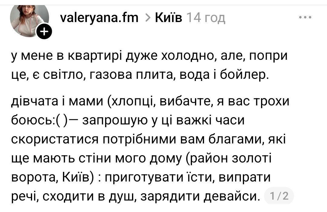 «Київ, центр. Є світло, опалення, гаряча вода. Пралка теж працює. Кому потрібно, будь ласка, звертайтеся». Або: «Оболонь. Може, комусь треба погрітися, пишіть. Є газ і тепло». І ще: «У нашому магазині (м. Дніпро) можна підзарядити техніку». Такими оголошеннями майорять усі соцмережі.