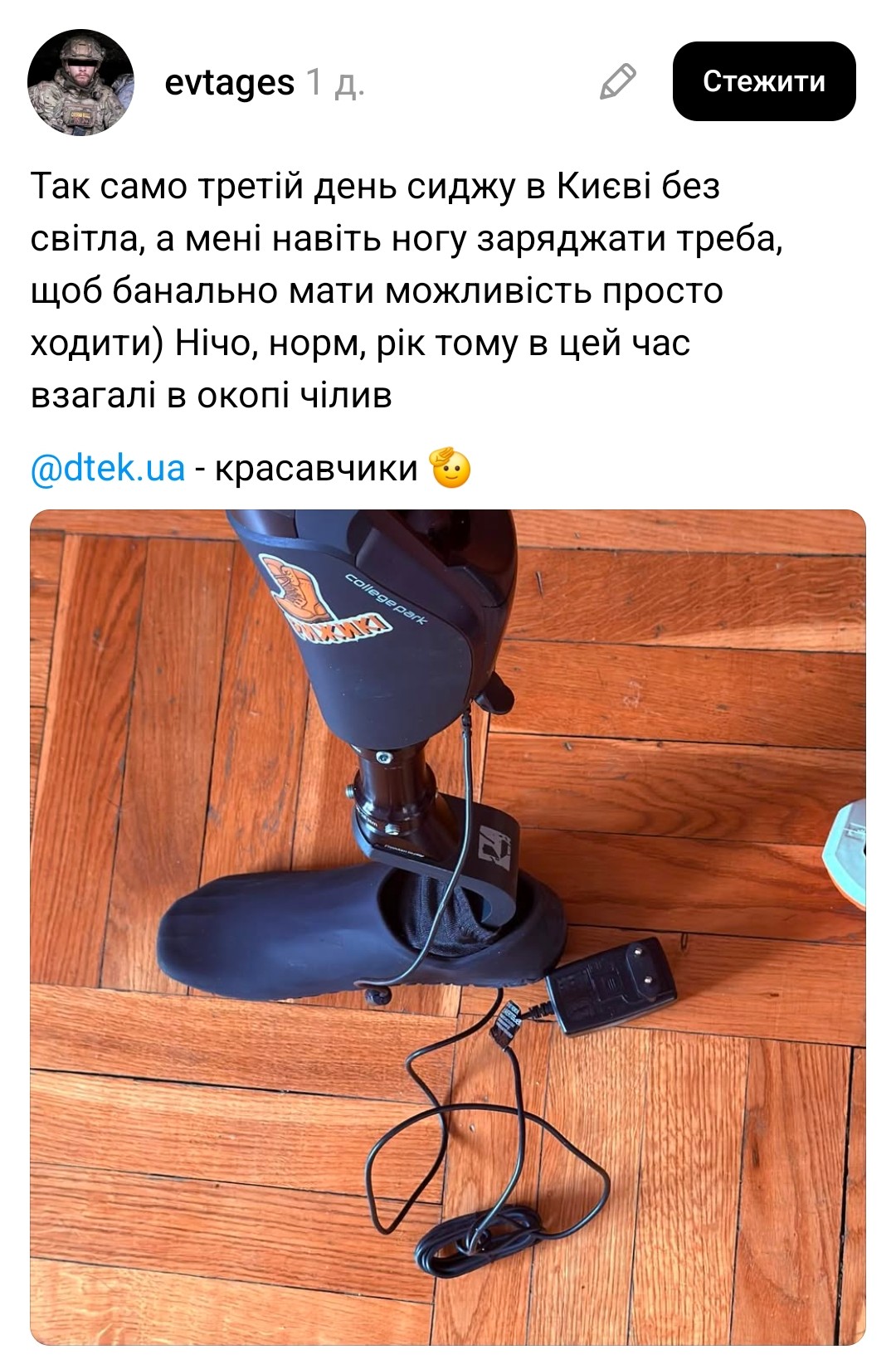 Саме тому під час довгих відключень електроенергії надзвичайно важливо допомагати людям із протезами. Запросити такого ветерана зарядити протез у теплій оселі, дати доступ до розетки, генератора чи павербанка - це фактично дати йому змогу знову стояти на ногах у прямому сенсі слова.