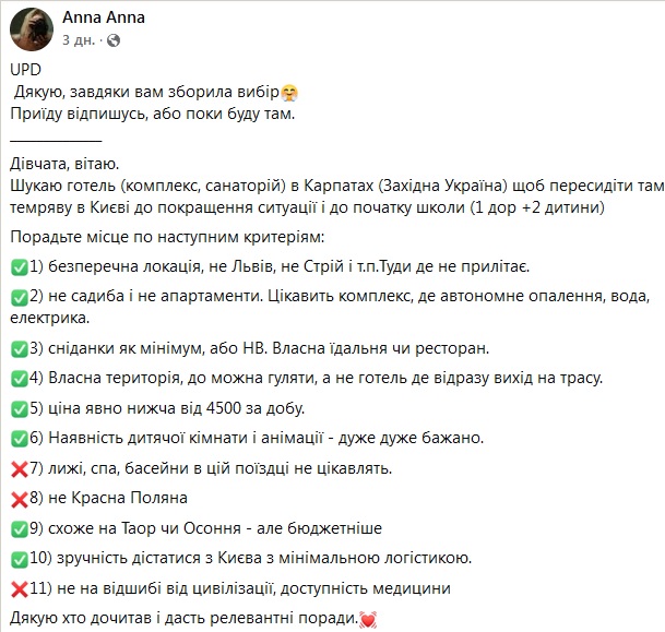 «Шукаю готель у західній частині України, щоб пересидіти там холод і темряву, що зараз у Києві». На таке оголошення і ще з десяток схожих можна натрапити у соцмережах.