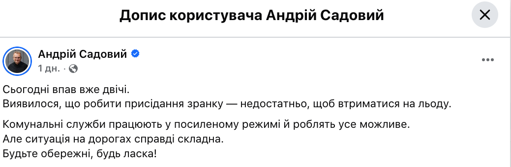 У Львові, судячи з посади міра, теж не все добре з чистими дорогами. Скрін ФБ Андрій Садовий