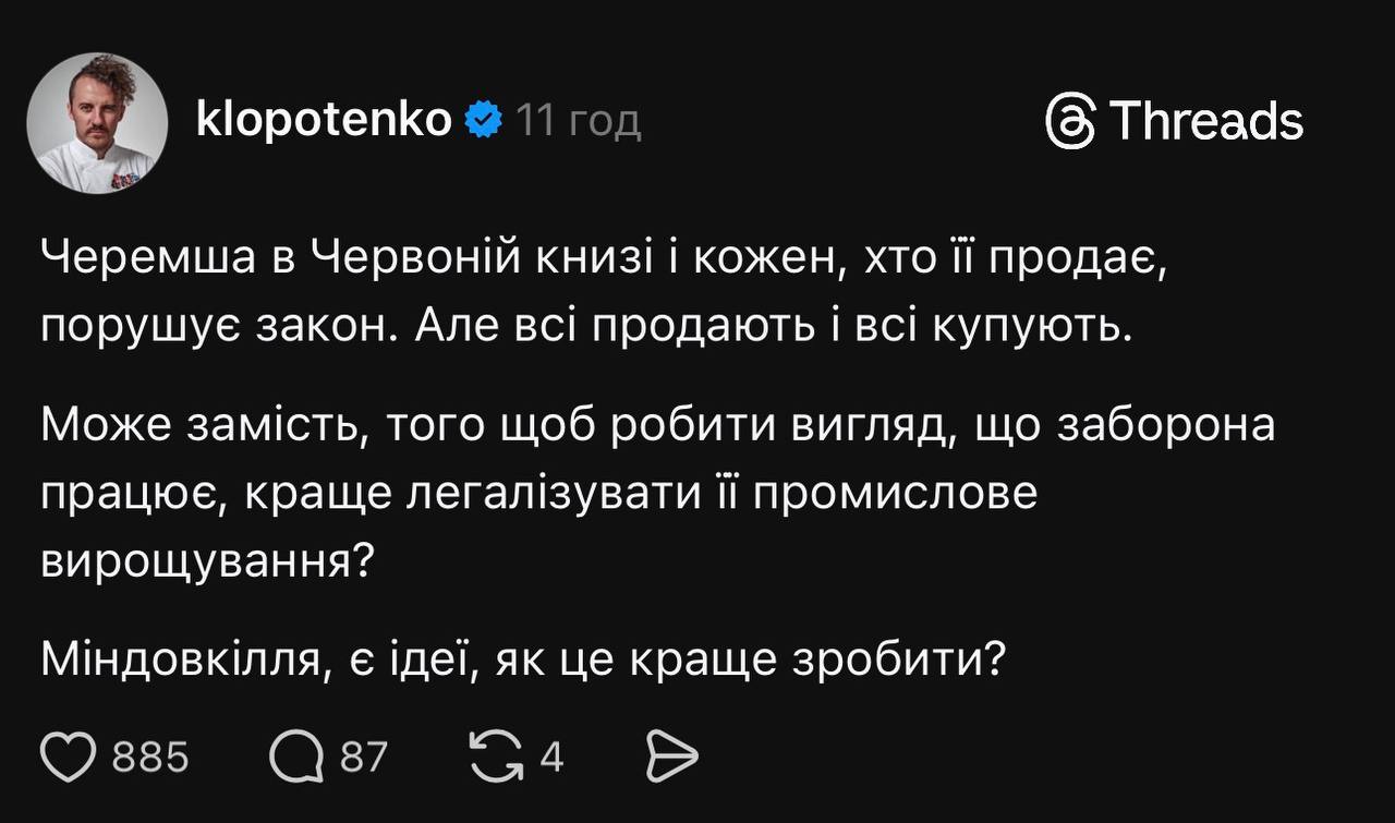 Український шеф-кухар і ресторатор Євген Клопотенко закликав «легалізувати» черемшу. У своєму Threads він зазначив, що попри те, що черемша знаходиться в Червоній книзі України й кожен, хто її продає, порушує закон, “але всі продають і всі купують”.