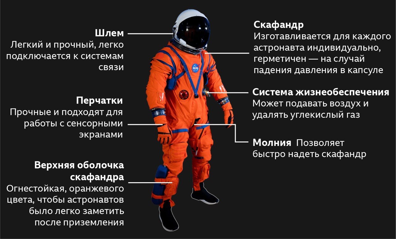 Ці скафандри використовуються під час старту та повернення в атмосферу Землі, а також слугують критично важливим захистом у разі проблем із капсулою. У надзвичайній ситуації під час польоту до Місяця або повернення астронавти швидко одягнуть скафандри. Система життєзабезпечення, якою вони оснащені, розрахована приблизно на шість днів — цього достатньо для повернення на Землю.