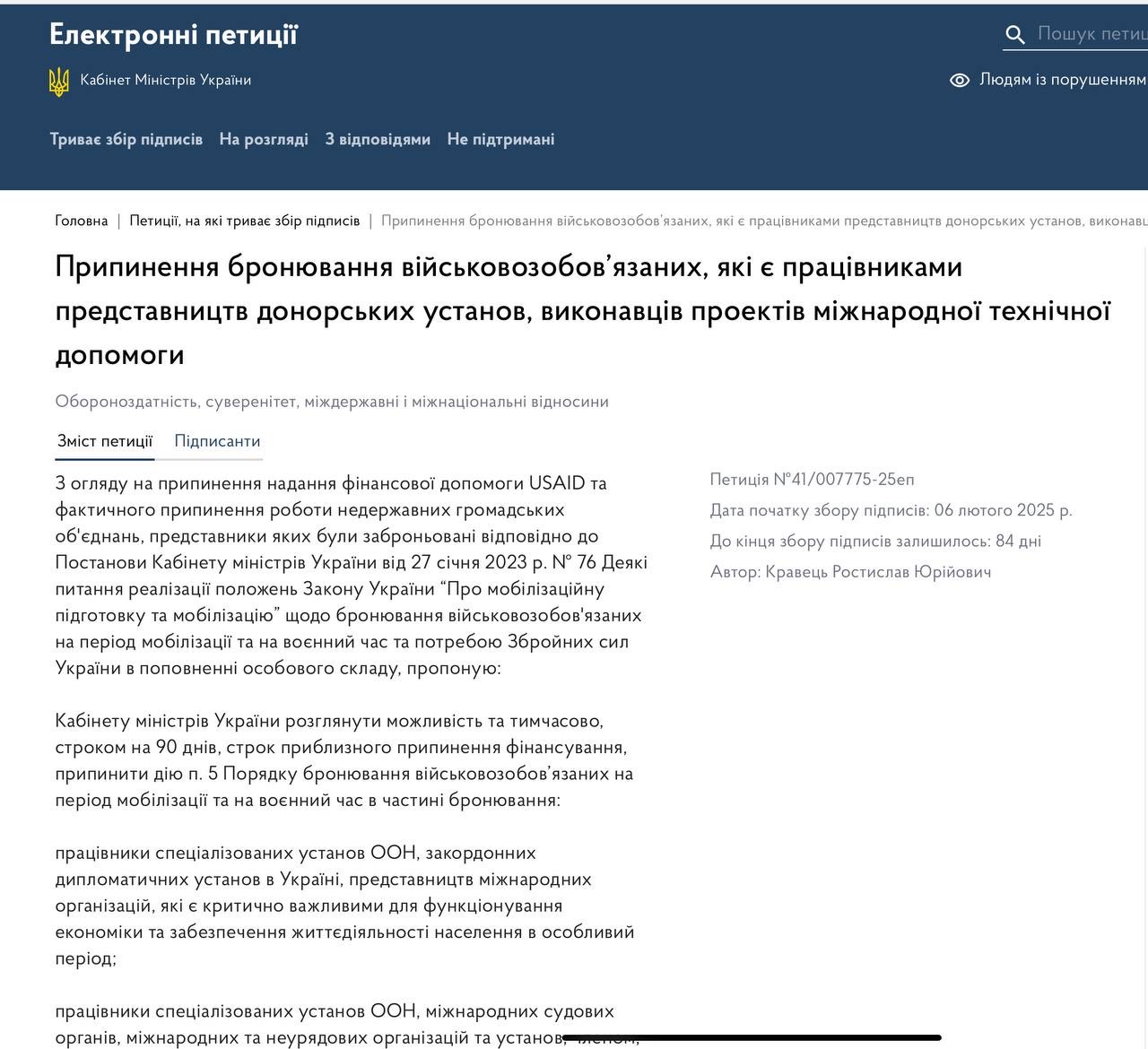 У петиції зазначається, що надання фінансової допомоги USAID та роботу недержавних громадських об'єднань фактично припинено. Відповідно від Уряду вимагається на 90 днів припинити дію п. 5 Порядку бронювання військовозобов’язаних на період мобілізації та на воєнний час, згідно з яким працівники представництв цих організацій та їхні ґрантоотримувачі звільнялись від призову. За цей час, вважає автор петиції, слід провести детальний аудит використання цими організаціями міжнародної допомоги та припинити бронювання остаточно тим, чиї кошти використовуються неефективно або не за призначенням.